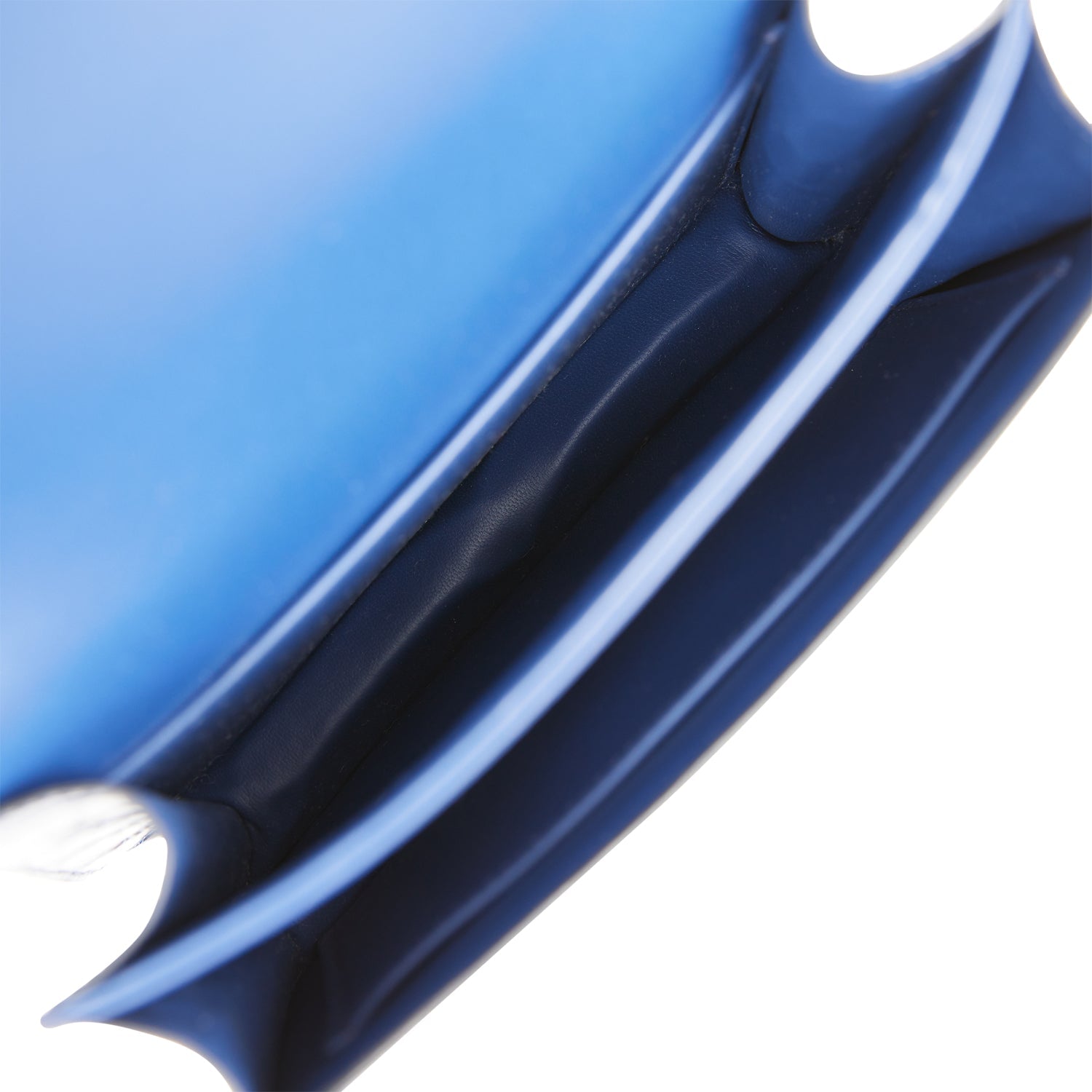 The interior is lined with Bleu Saphir lambskin and has an open pocket on the front wall, a center divide, and a slit pocket on the back wall.