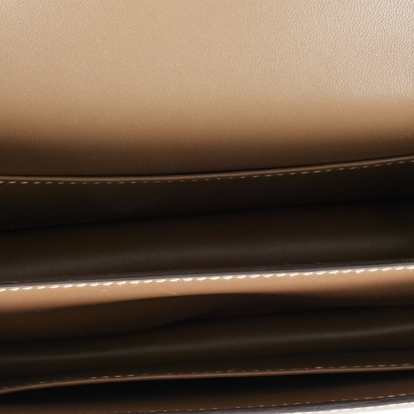 The interior is lined with Etoupe lambskin and has an open pocket on the front wall, a center divide, and a slit pocket on the back wall.