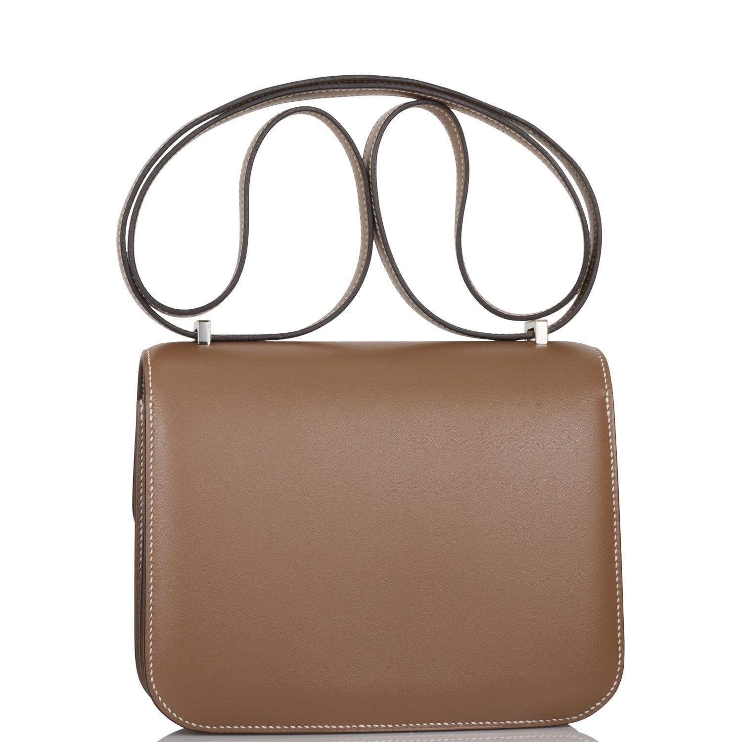 This Constance is in Etoupe tadelakt leather with palladium hardware and has contrast stitching, a metal "H" snap lock closure and adjustable shoulder strap.