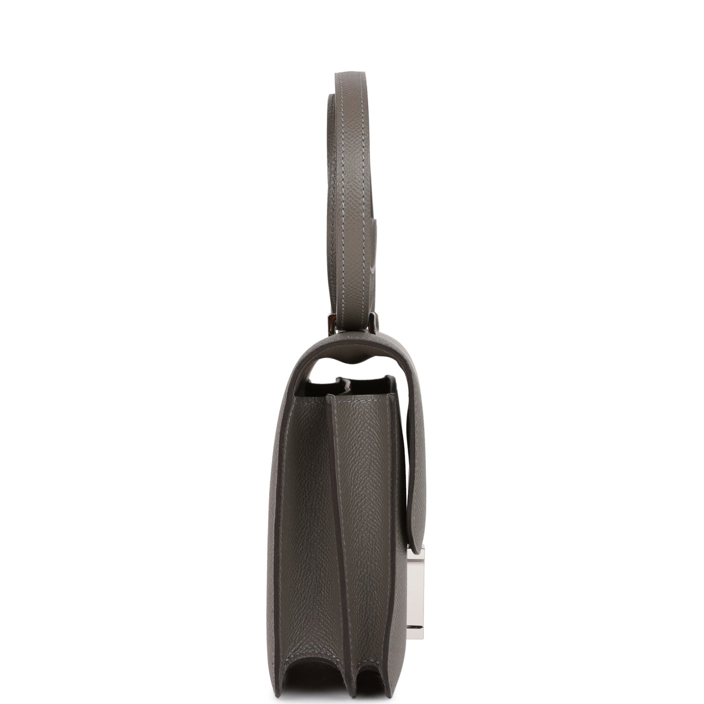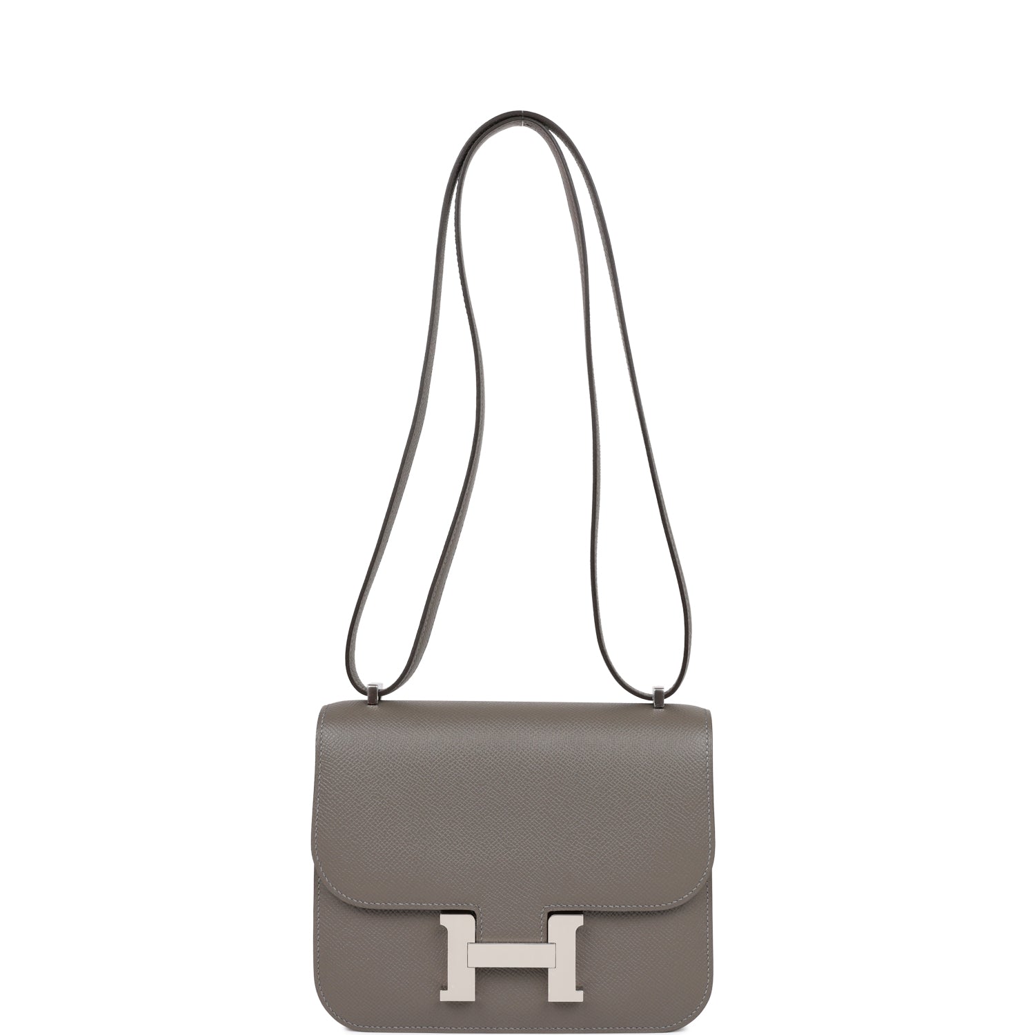 This Constance is in Gris Meyer epsom leather with palladium hardware and has tonal stitching, a metal "H" snap lock closure and adjustable shoulder strap.