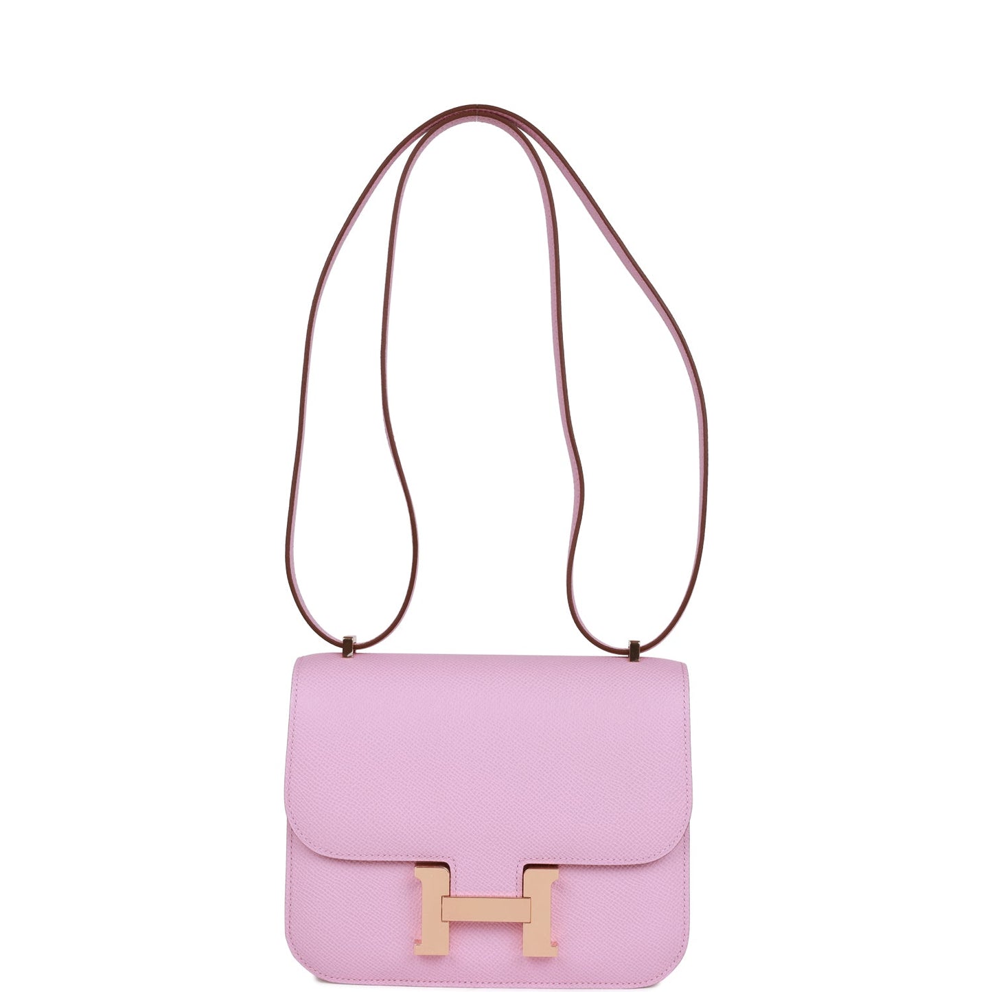 This Constance is in Mauve Sylvestre epsom leather with rose gold hardware and has tonal stitching, a metal "H" snap lock closure and adjustable shoulder strap.