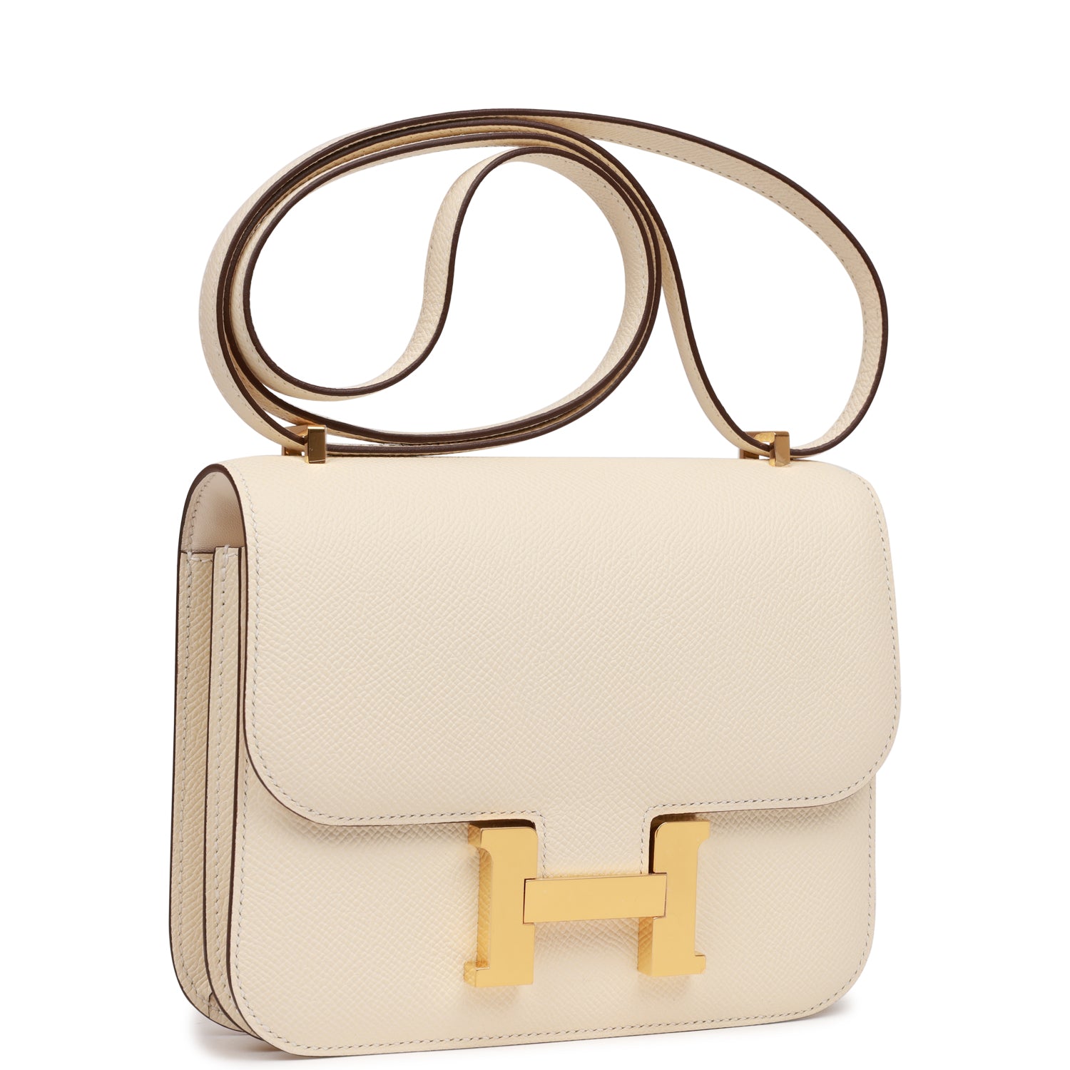This Constance is in Nata epsom leather with gold hardware and has tonal stitching, a metal "H" snap lock closure and adjustable shoulder strap.