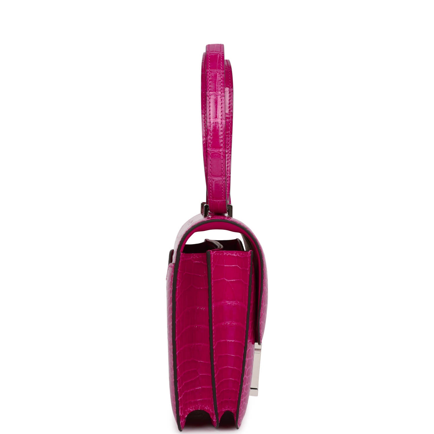 This Constance is of Rose Mexico shiny alligator with palladium hardware and features tonal stitching, a "H" snap lock closure, and an adjustable shoulder strap.