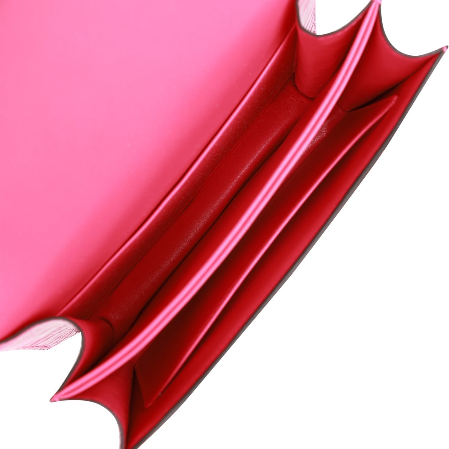 The interior is lined with Rose Mexico lambskin and has an open pocket on the front wall, a center divide, and a slit pocket on the back wall.