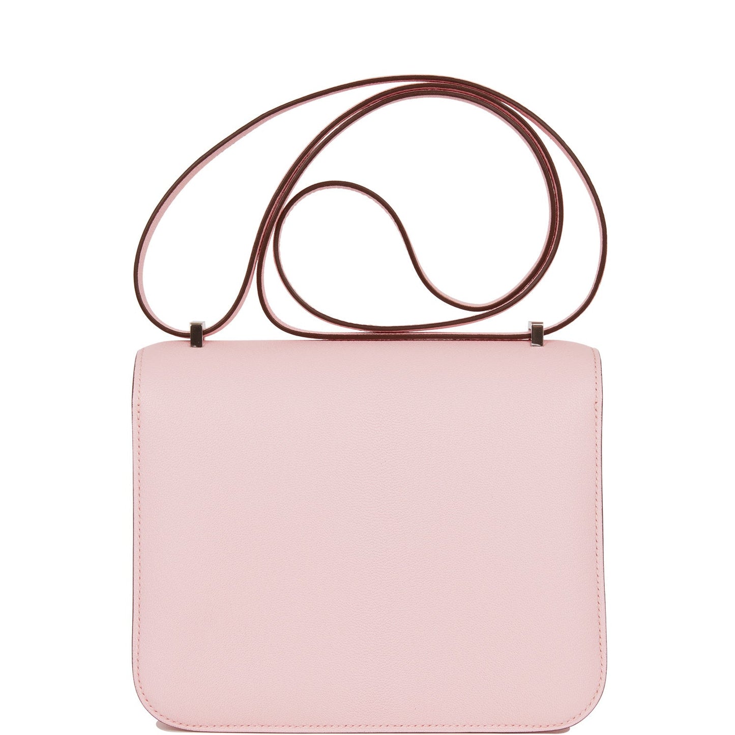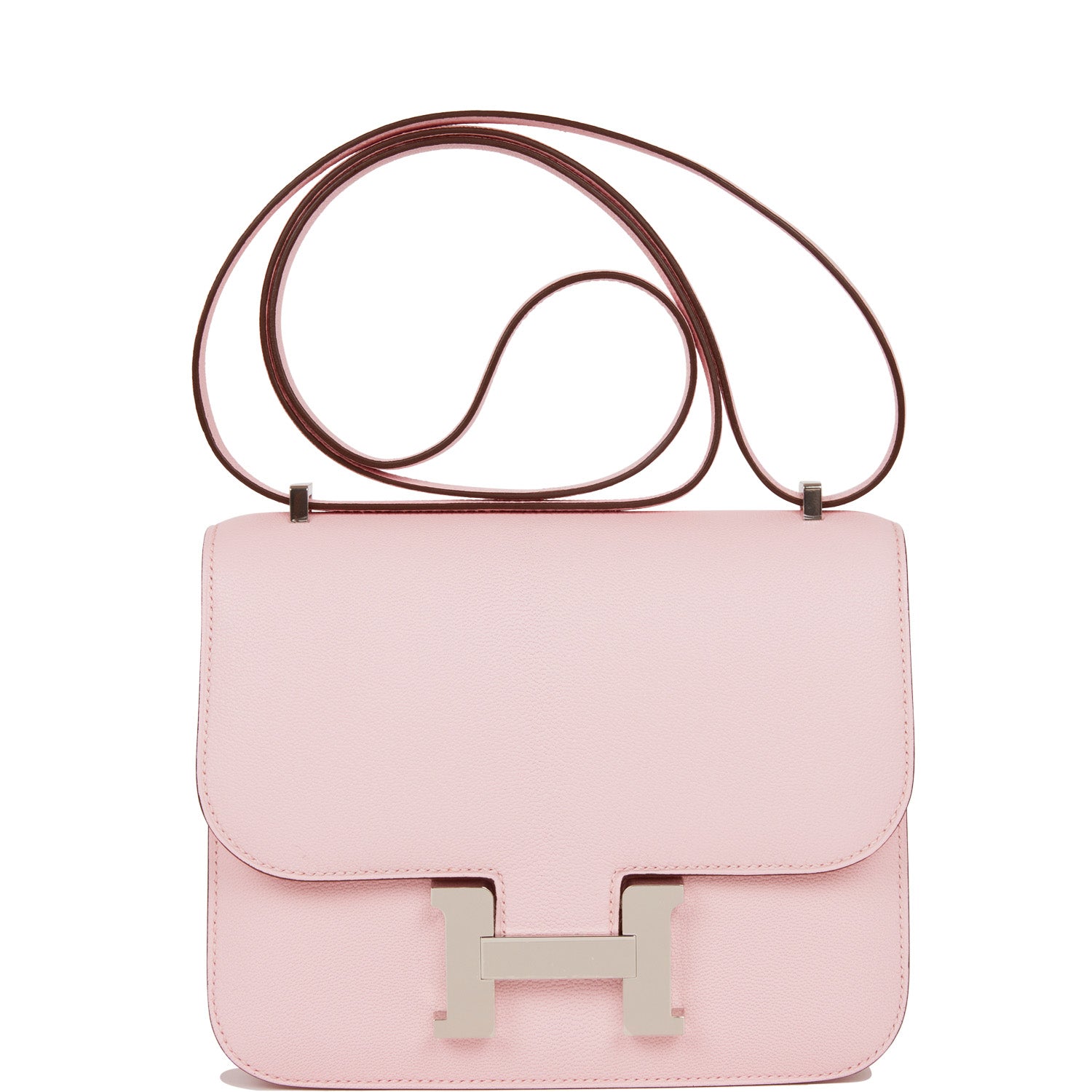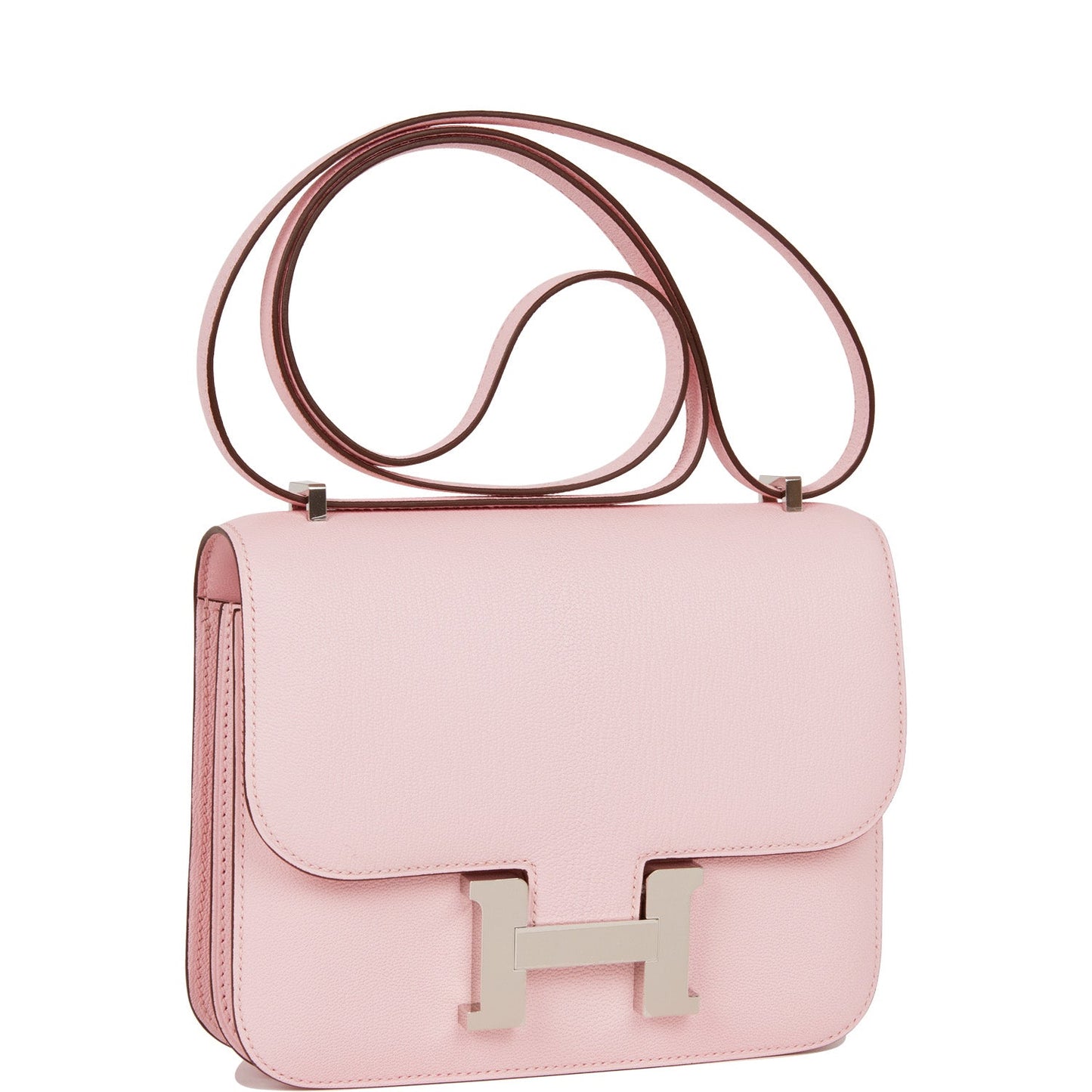 This Constance is in Rose Sakura chevre leather with palladium hardware and has tonal stitching, a metal "H" snap lock closure and adjustable shoulder strap.