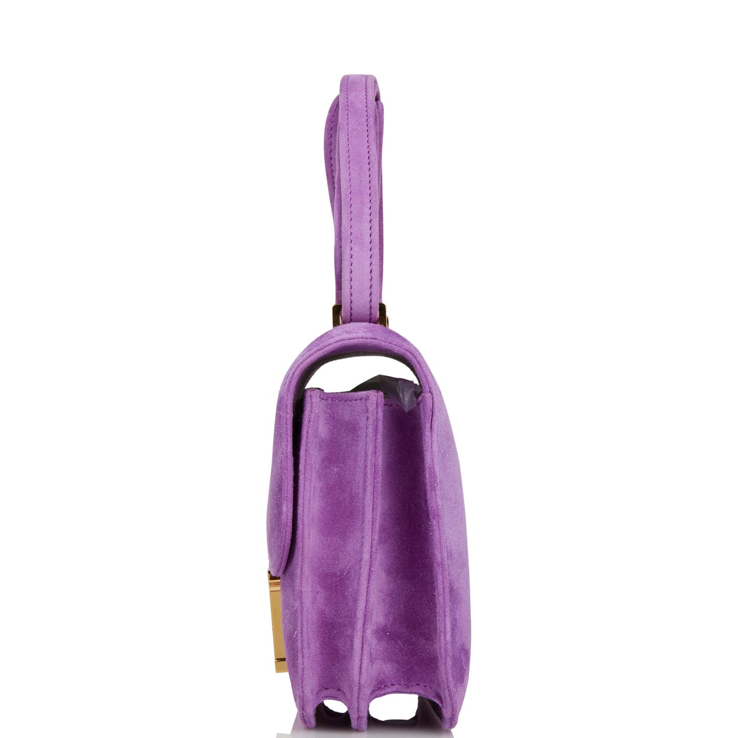 This Constance is in Violet doblis leather with gold hardware and has tonal stitching, a metal "H" snap lock closure and adjustable shoulder strap.