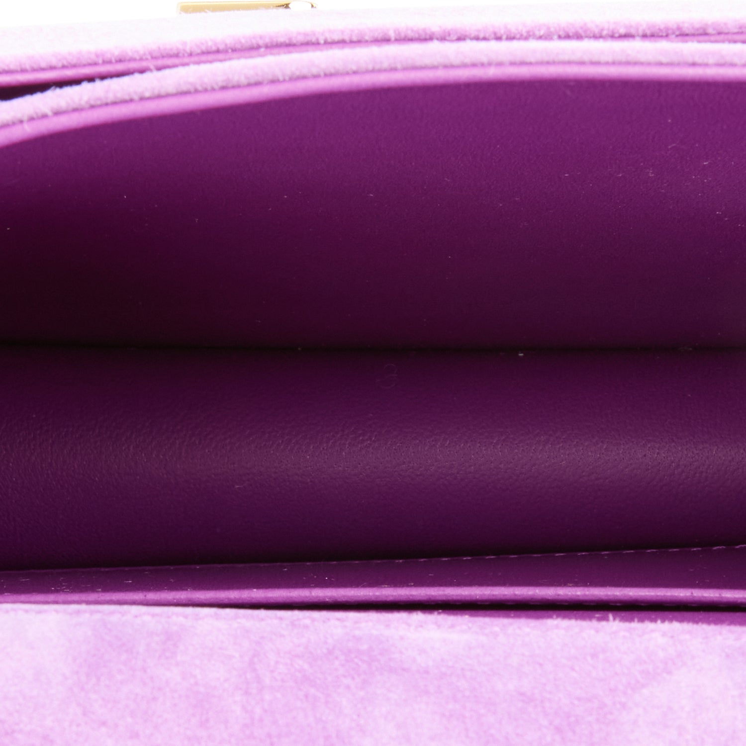 The interior is lined with Violet lambskin and has an open pocket on the front wall, a center divide, and a slit pocket on the back wall.