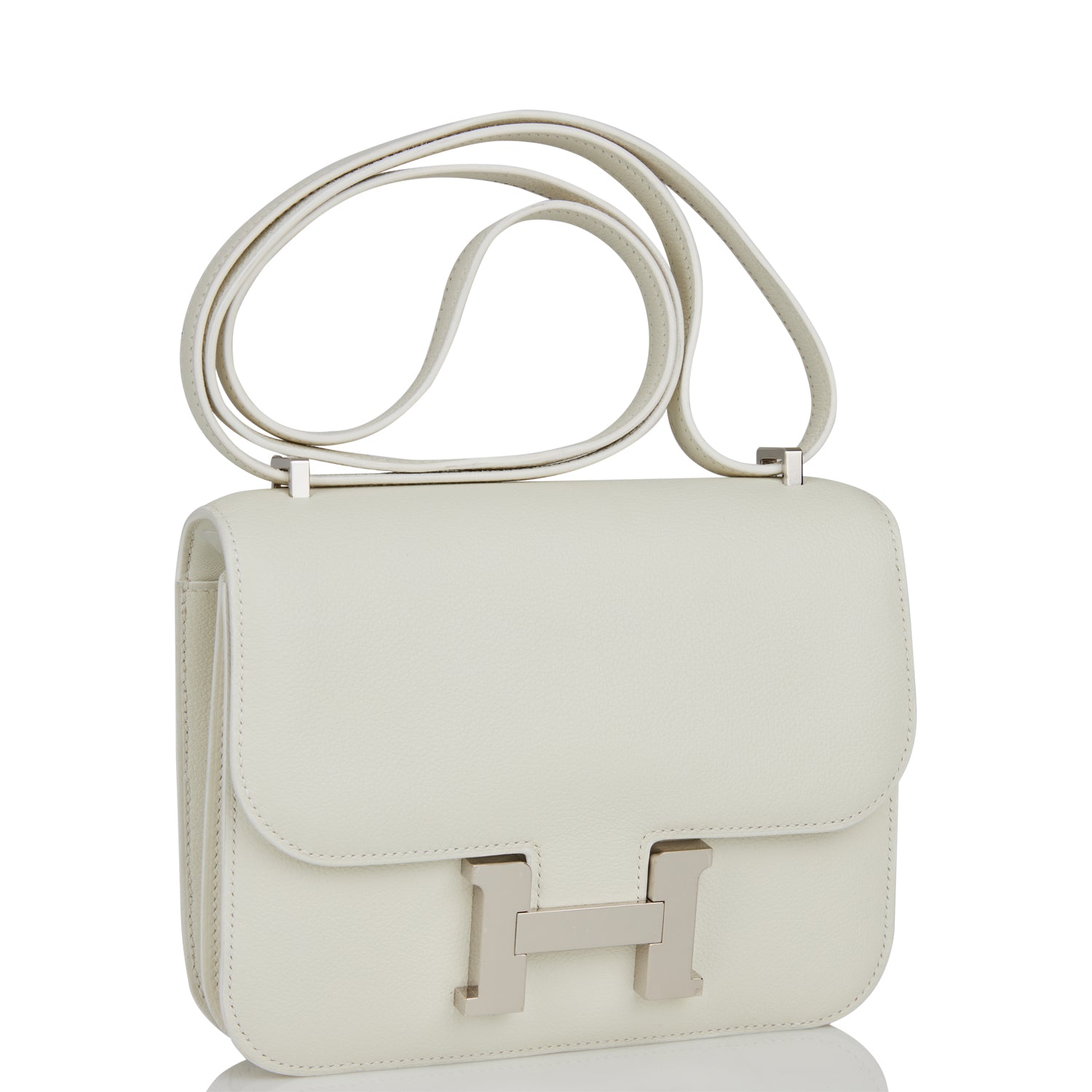 This Constance is in White evercolor leather with palladium hardware and has tonal stitching, a metal "H" snap lock closure and adjustable shoulder strap.
