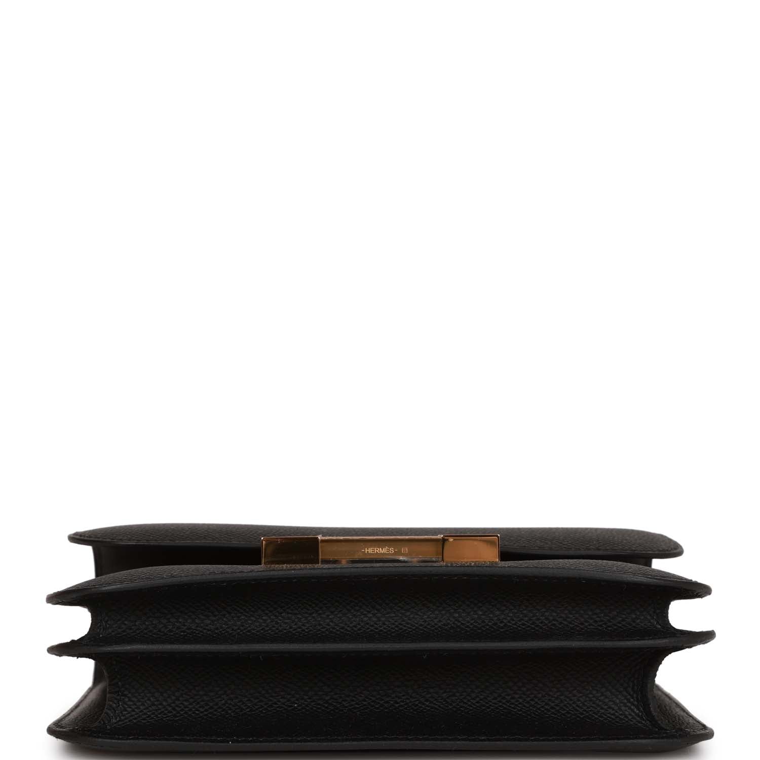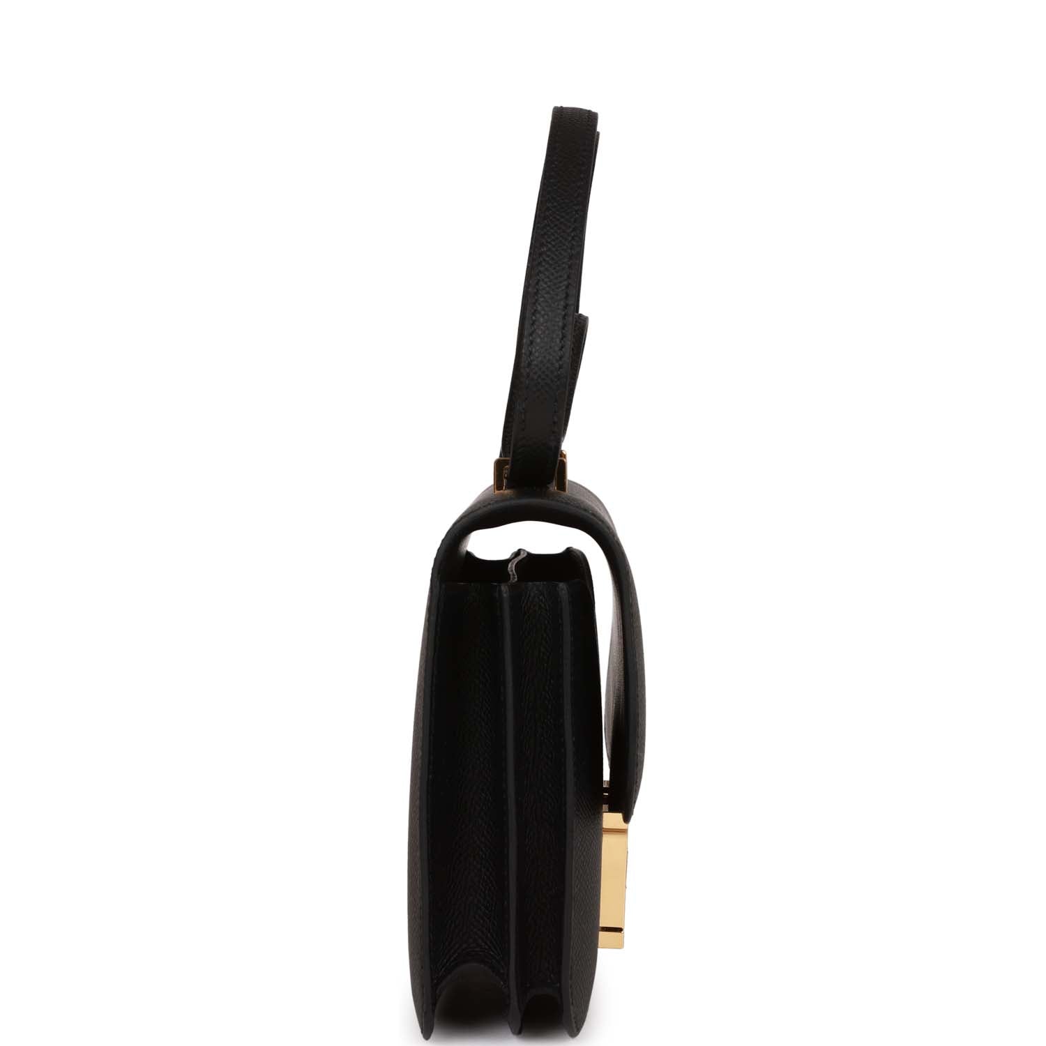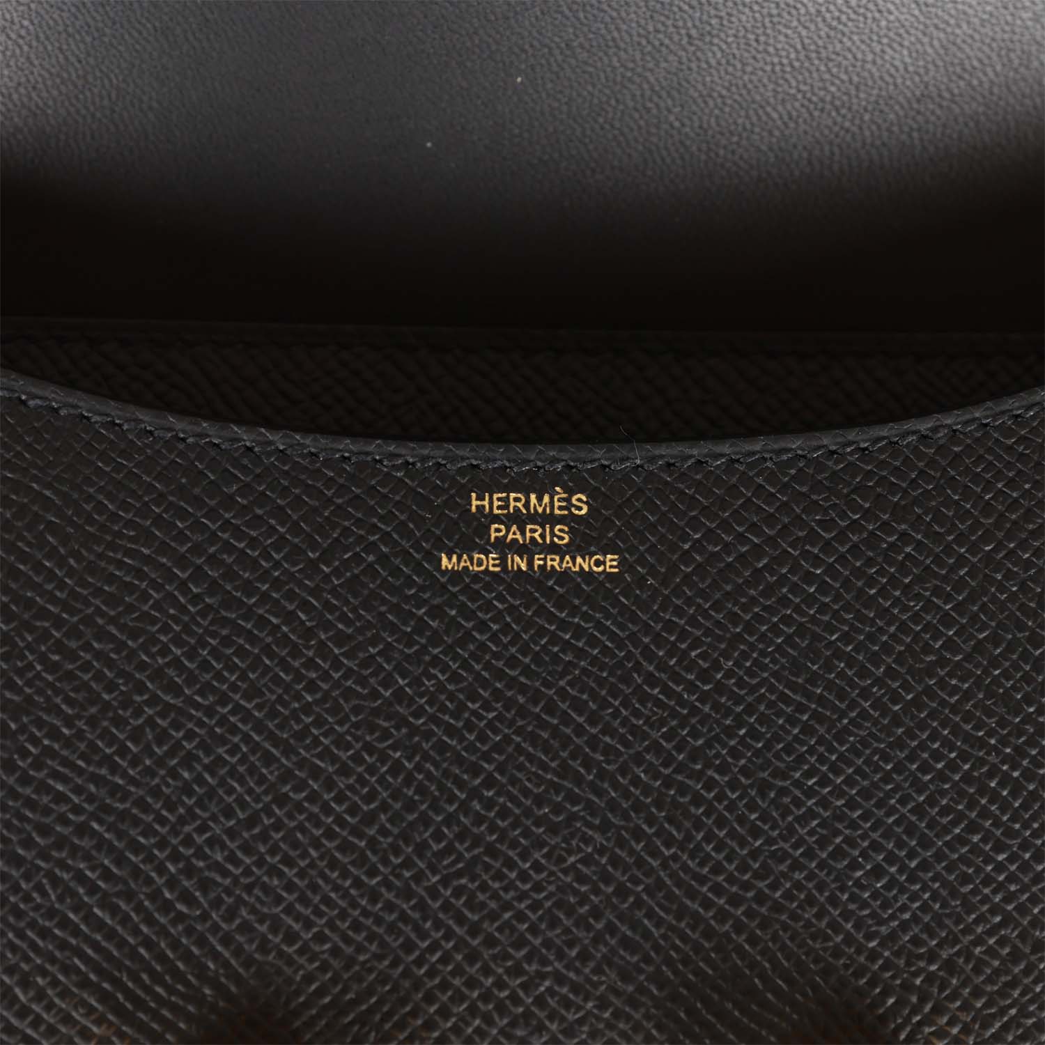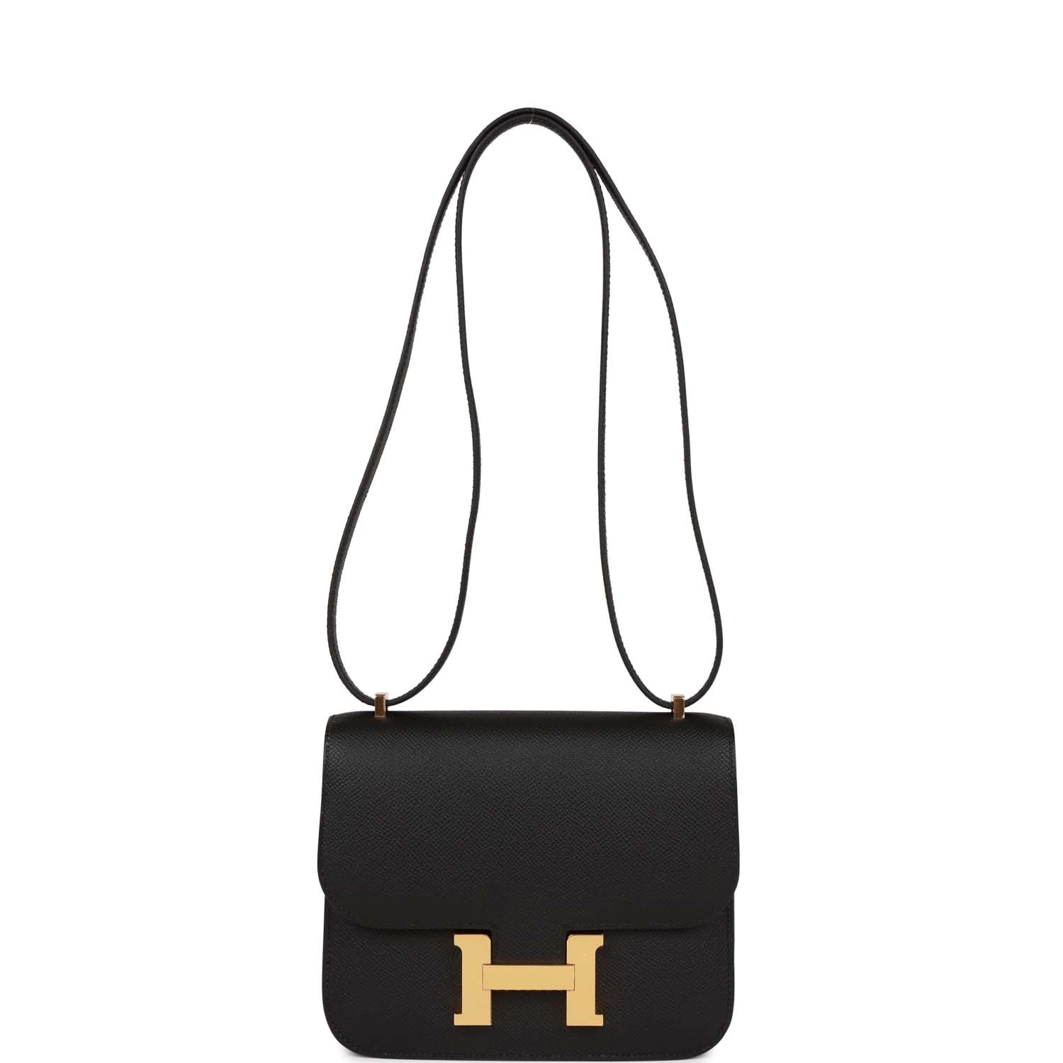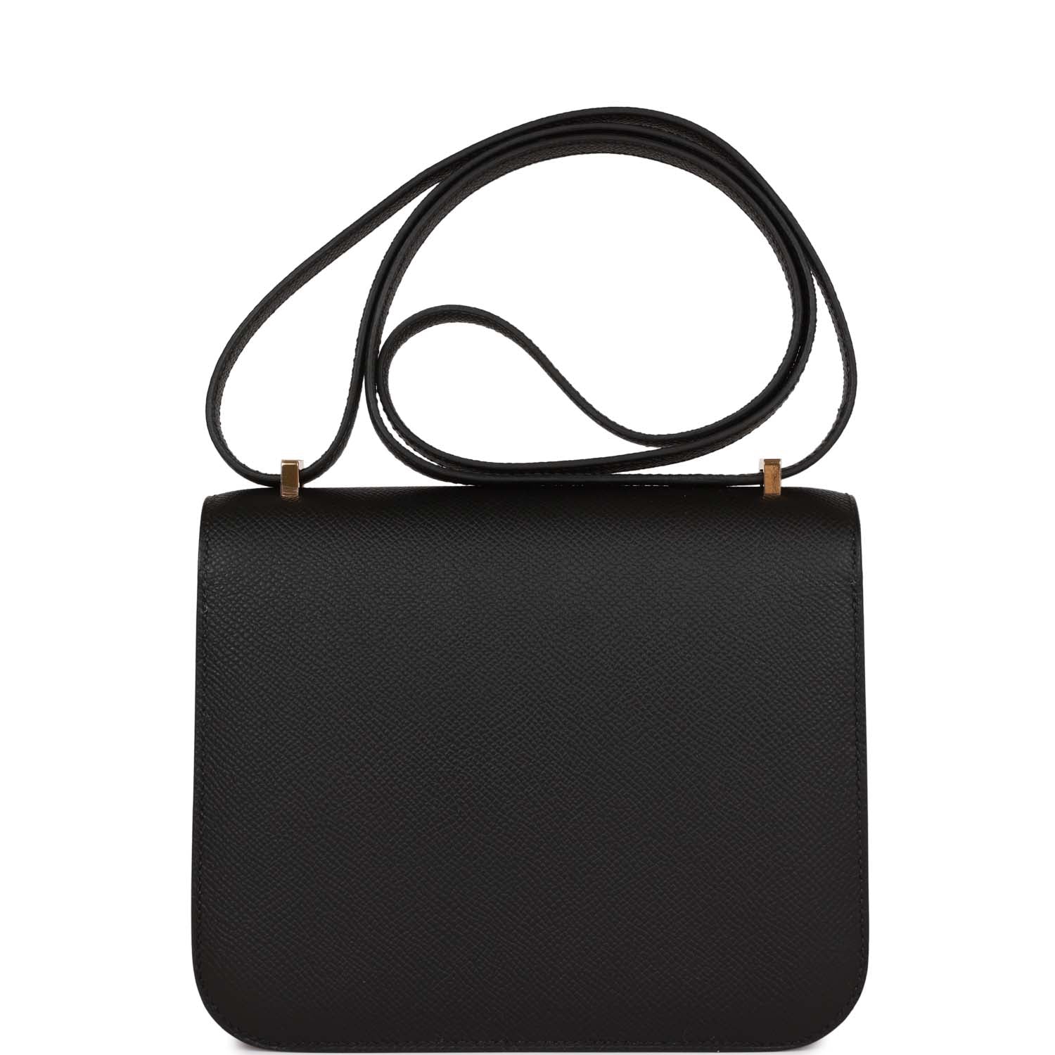 This Hermes Constance 18cm is in Black epsom leather with gold hardware and has tonal stitching, a metal "H" snap lock closure and adjustable shoulder strap.