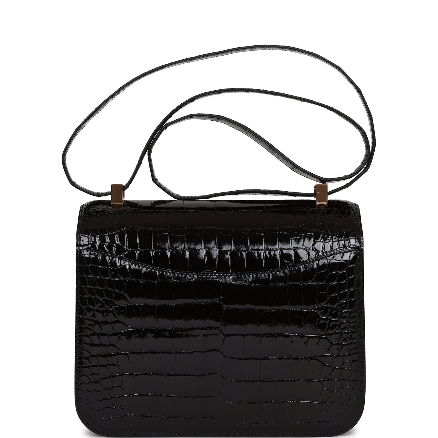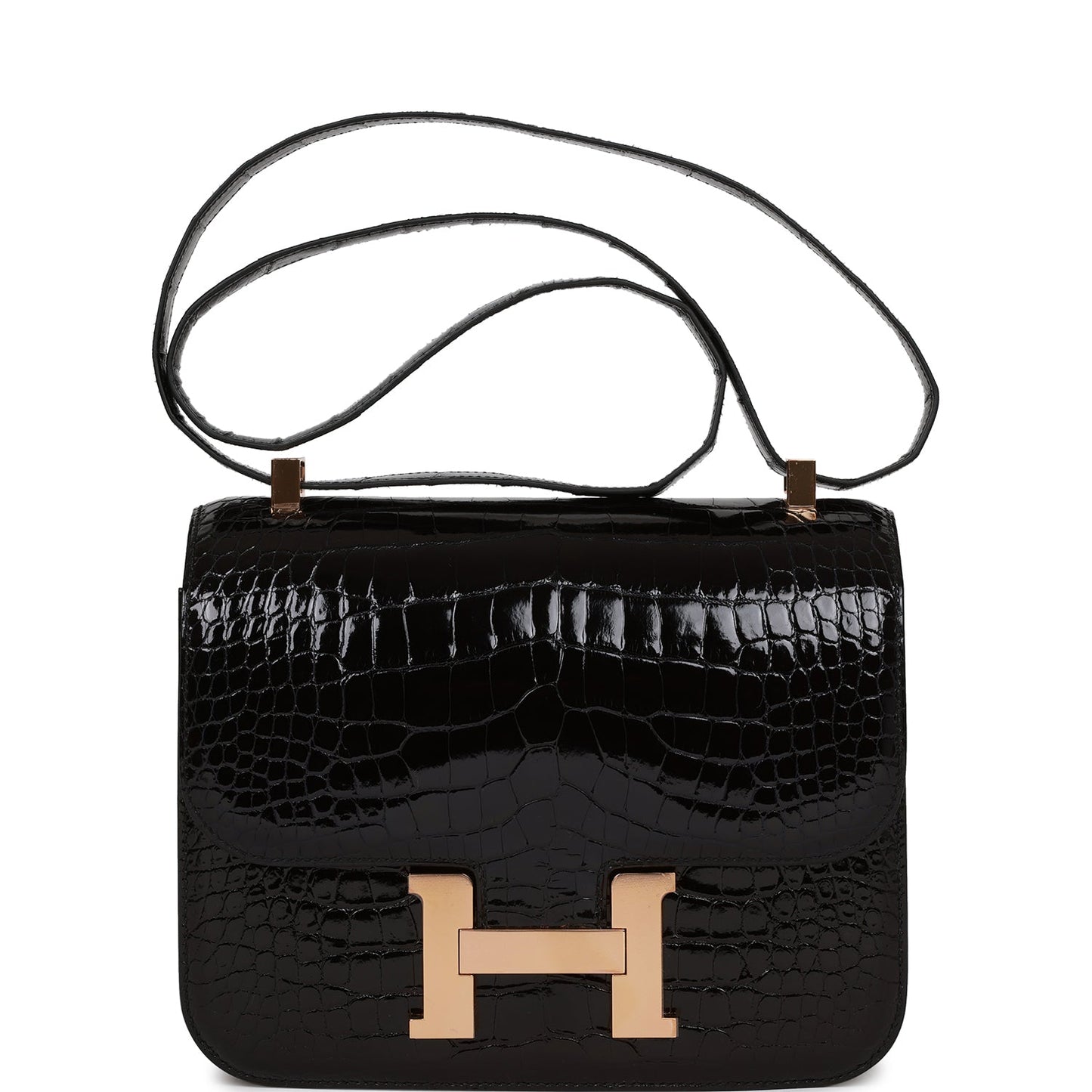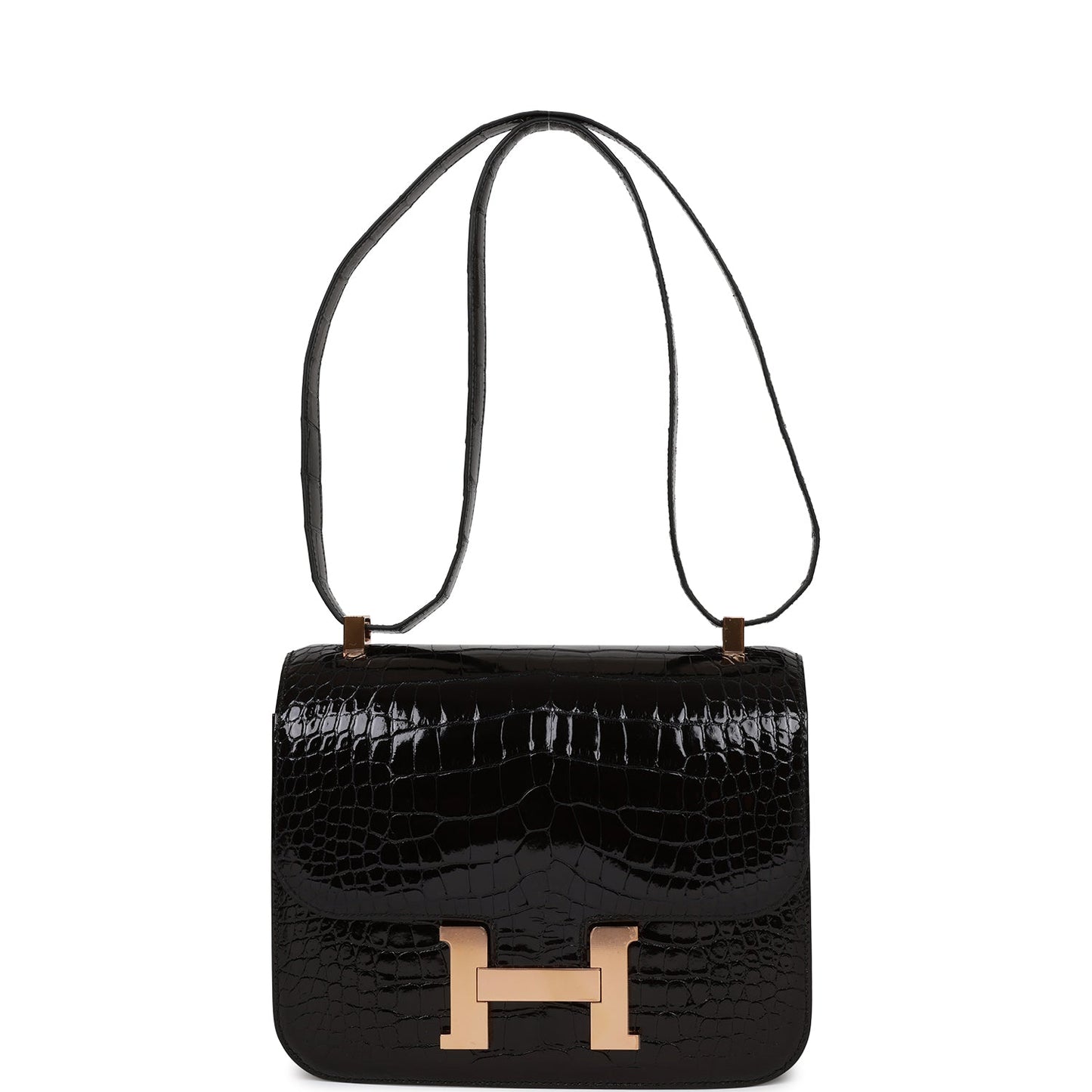 This Constance is of Black shiny alligator with rose gold hardware and features tonal stitching, a "H" snap lock closure, and an adjustable shoulder strap.