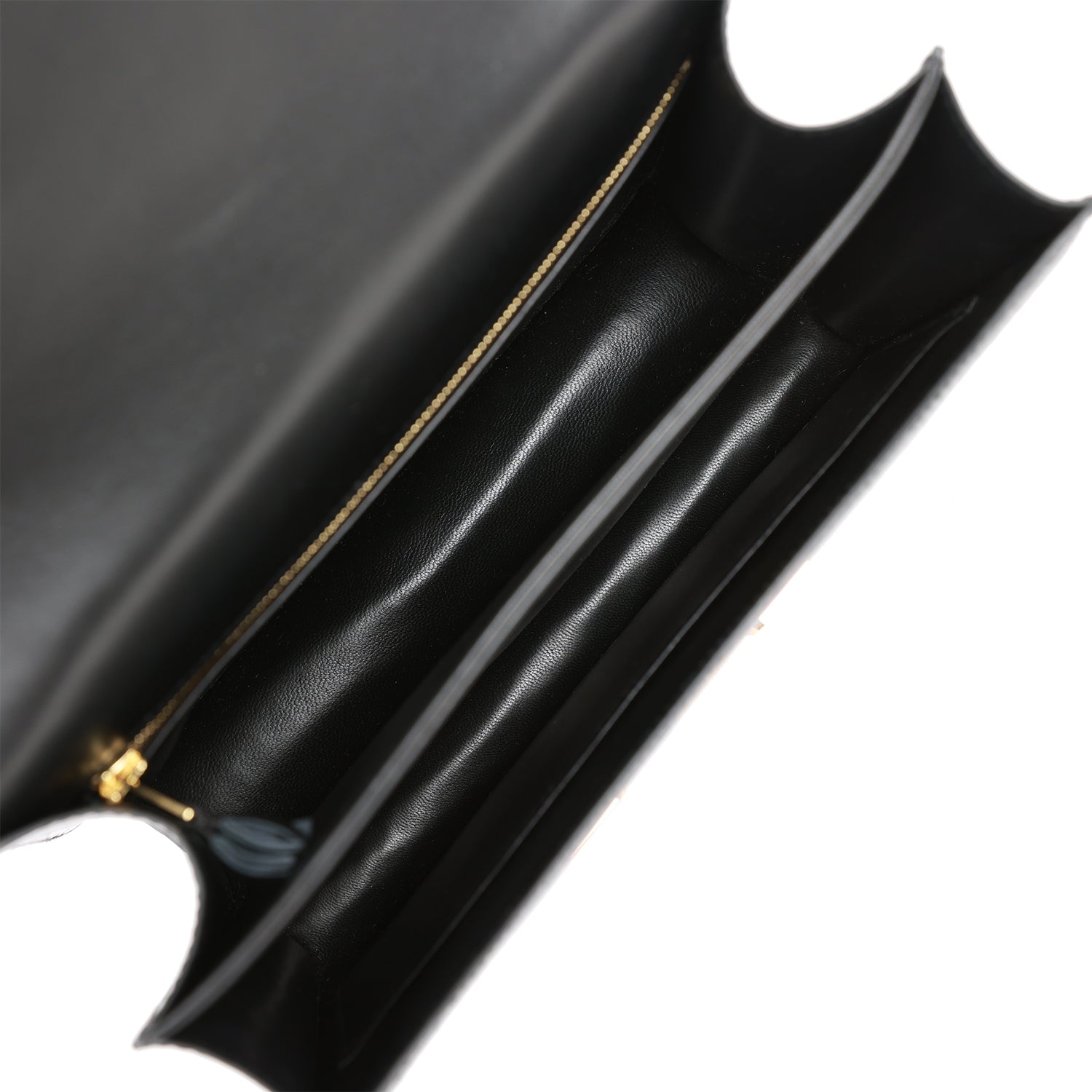 The interior is lined with black lambskin and has an open pocket on the front wall, two main compartments, back zip pocket and a slit pocket on the back wall.