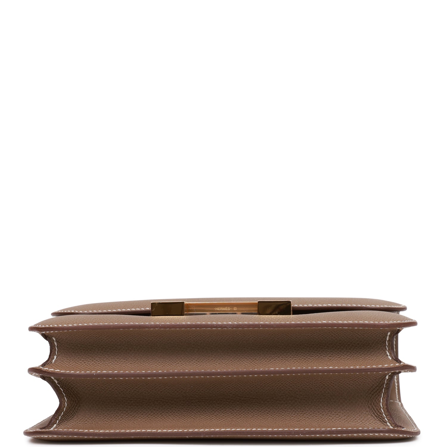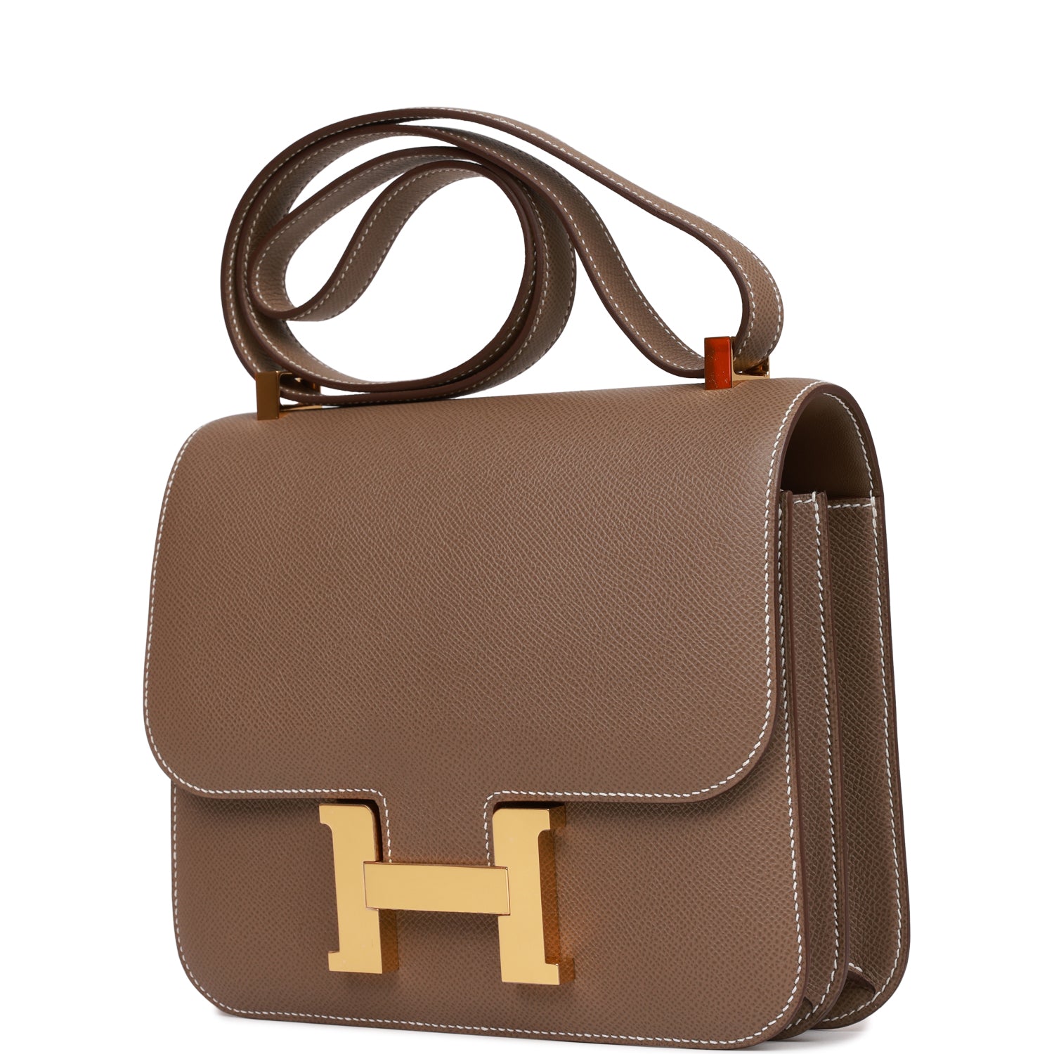 This Constance is in Etoupe epsom leather with gold hardware and has contrast stitching, a metal "H" snap lock closure, and adjustable shoulder strap.