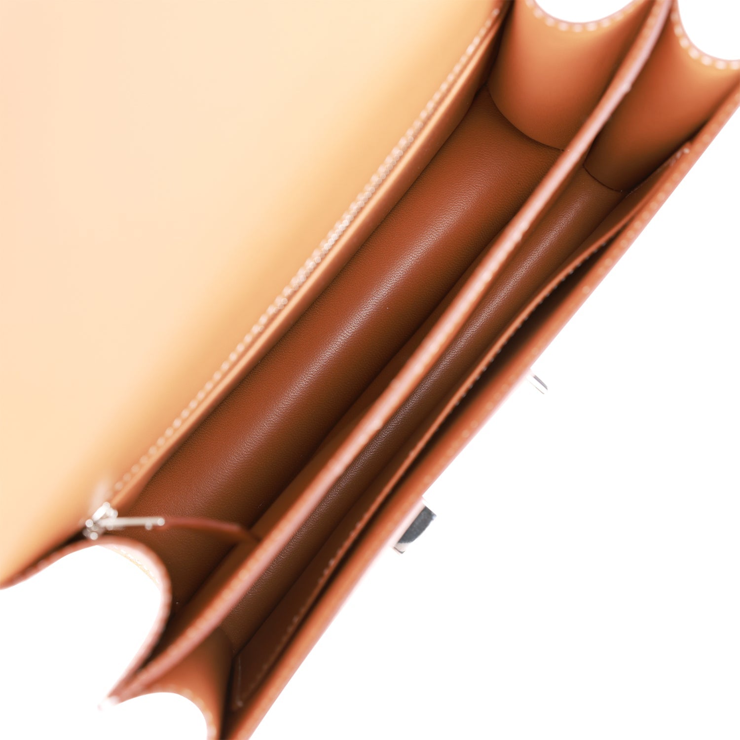 The interior is lined with gold lambskin leather and has a zip pocket with an Hermes engraved pull.