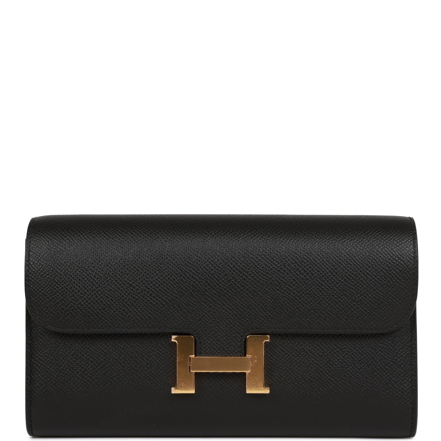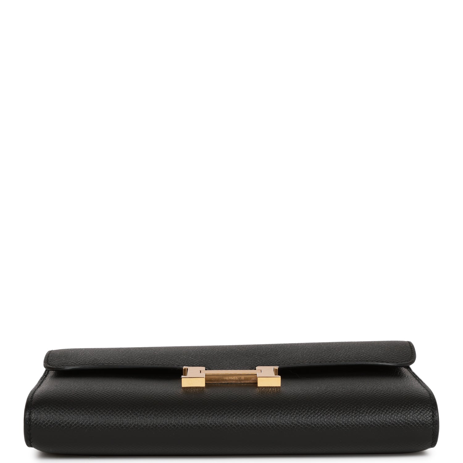 This Constance Wallet To Go is in Black epsom leather with gold hardware and has tonal stitching, metal "H" snap lock closure, open front compartment and removable crossbody strap.