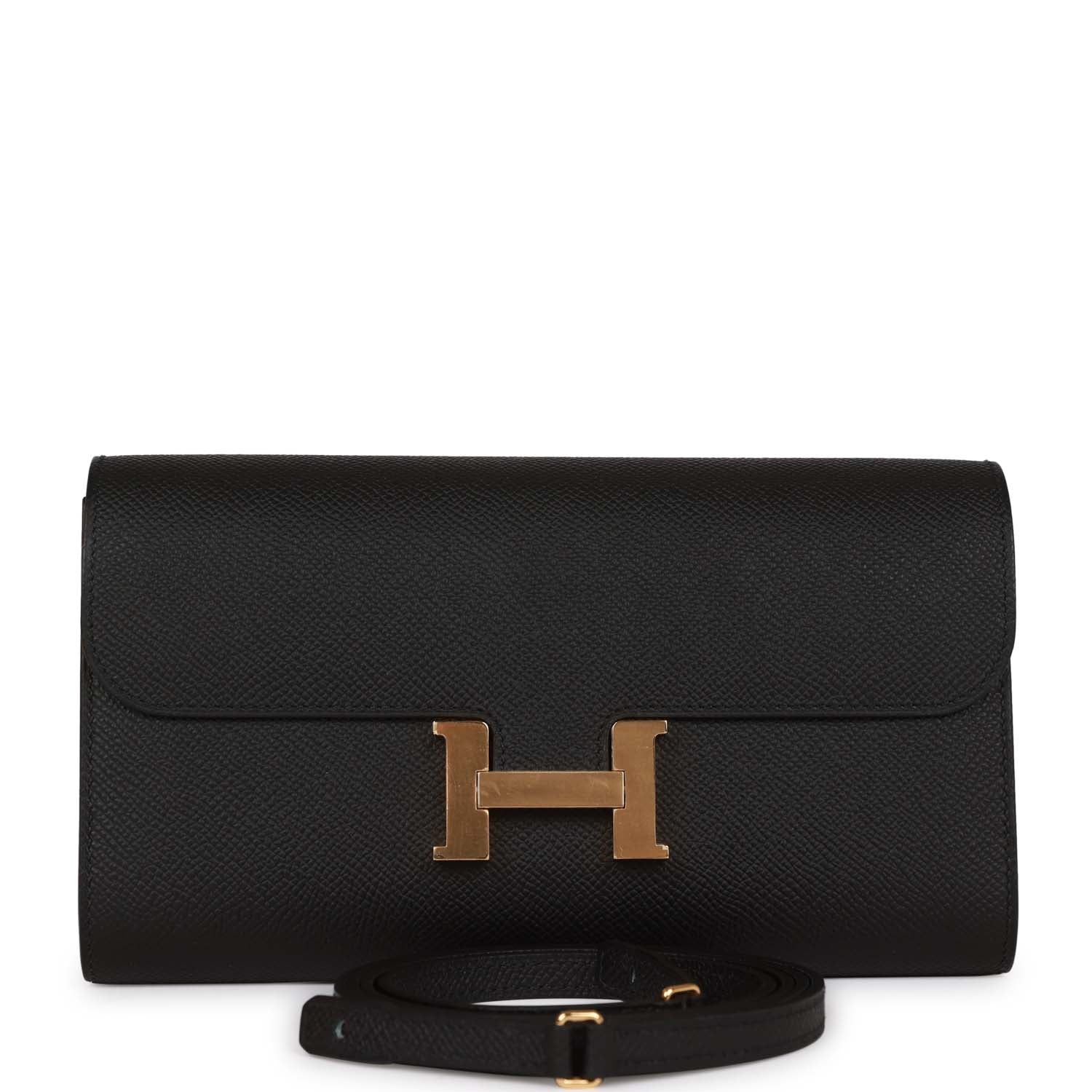 This Constance Wallet To Go is in Black epsom leather with gold hardware and has tonal stitching, metal "H" snap lock closure, open front compartment and removable crossbody strap.