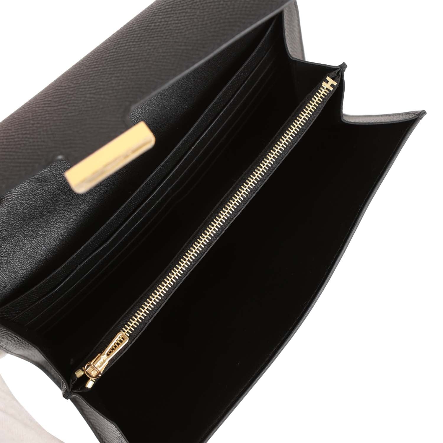 The interior is lined with black epsom leather and two main compartments with six credit card slots and a zippered center compartment with Hermes H lock pull.