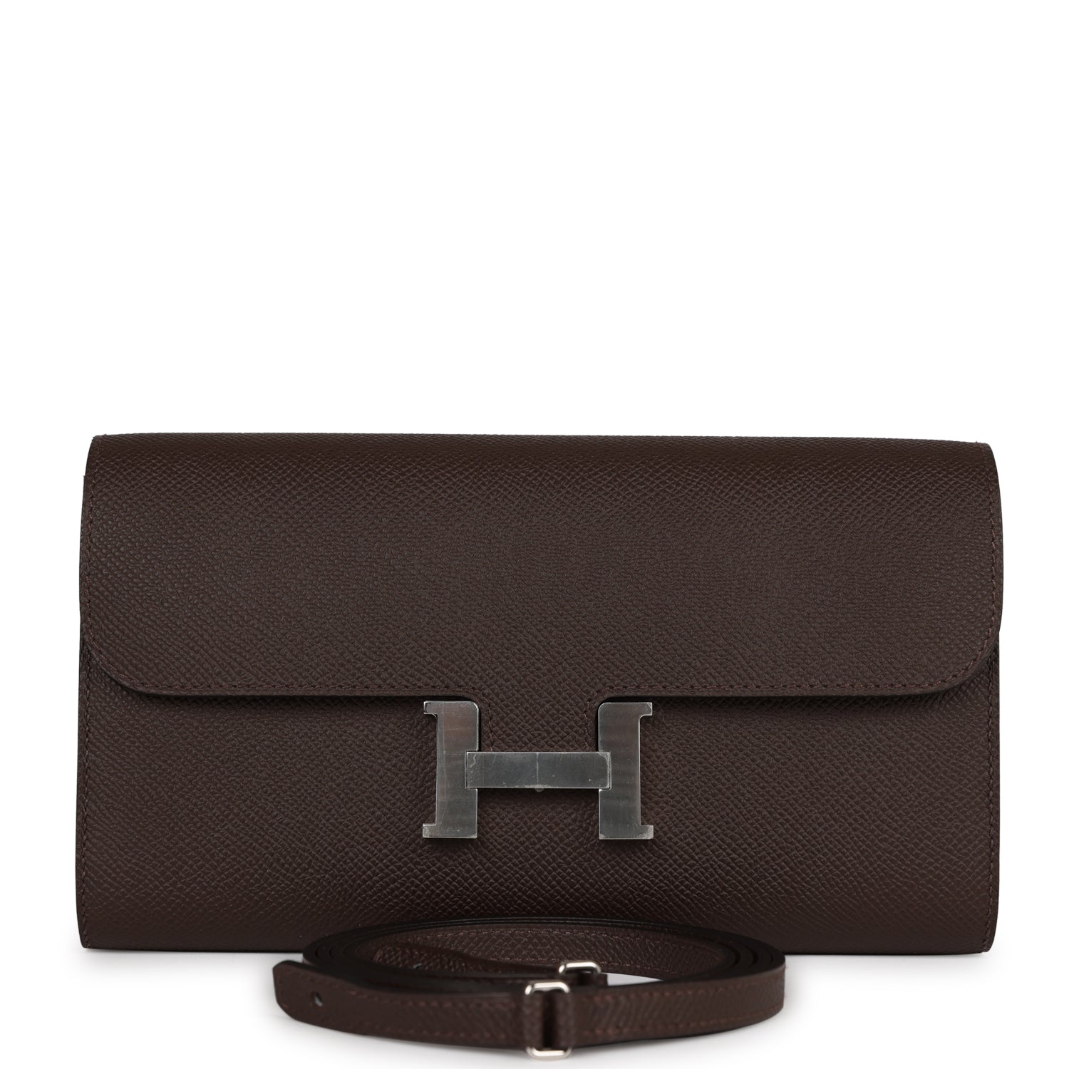 This Constance Wallet To Go is in Chocolate epsom leather with palladium hardware, has tonal stitching, metal "H" snap lock closure, open front compartment and removable crossbody strap.