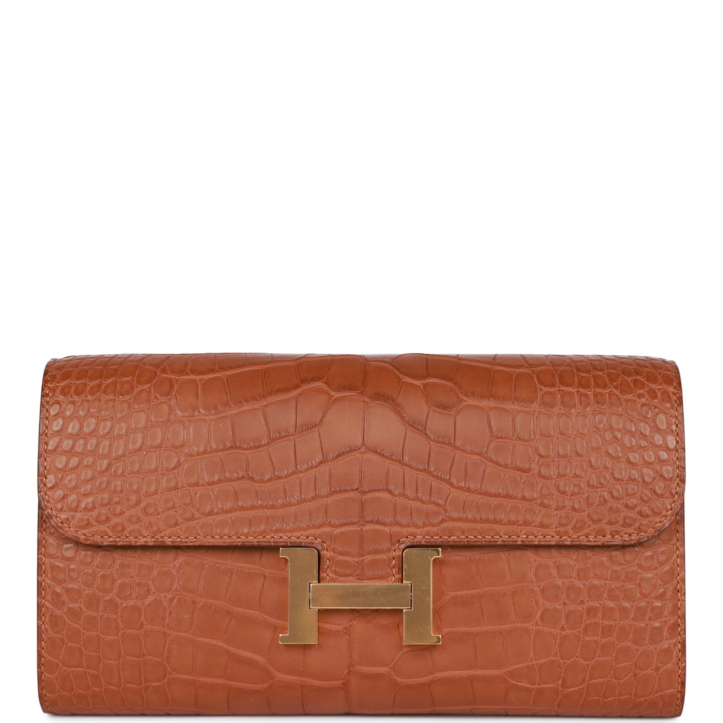 This Constance Wallet To Go is in Gold matte alligator with gold hardware and has tonal stitching, metal "H" snap lock closure, open front compartment and removable crossbody strap.