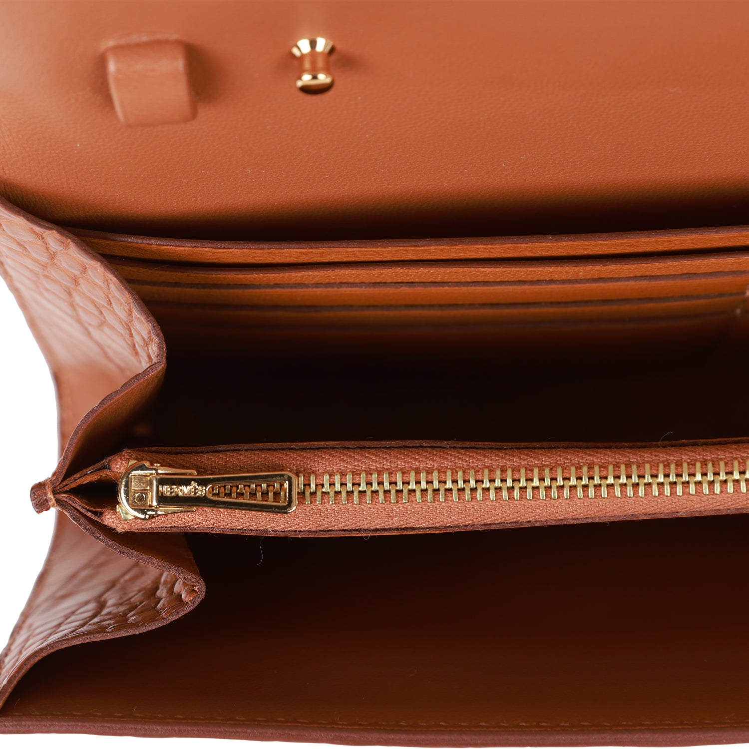 The interior is lined with Gold lambskin and features two main compartments with six credit card slots and a zippered center compartment with Hermes H lock pull.