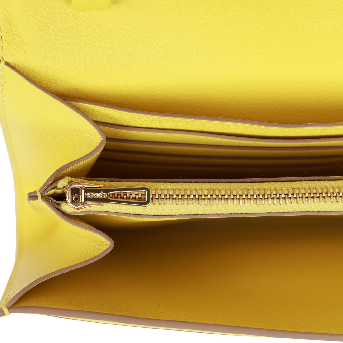 The interior is lined with Lime evercolor leather and two main compartments with six credit card slots and a zippered center compartment with Hermes H lock pull.