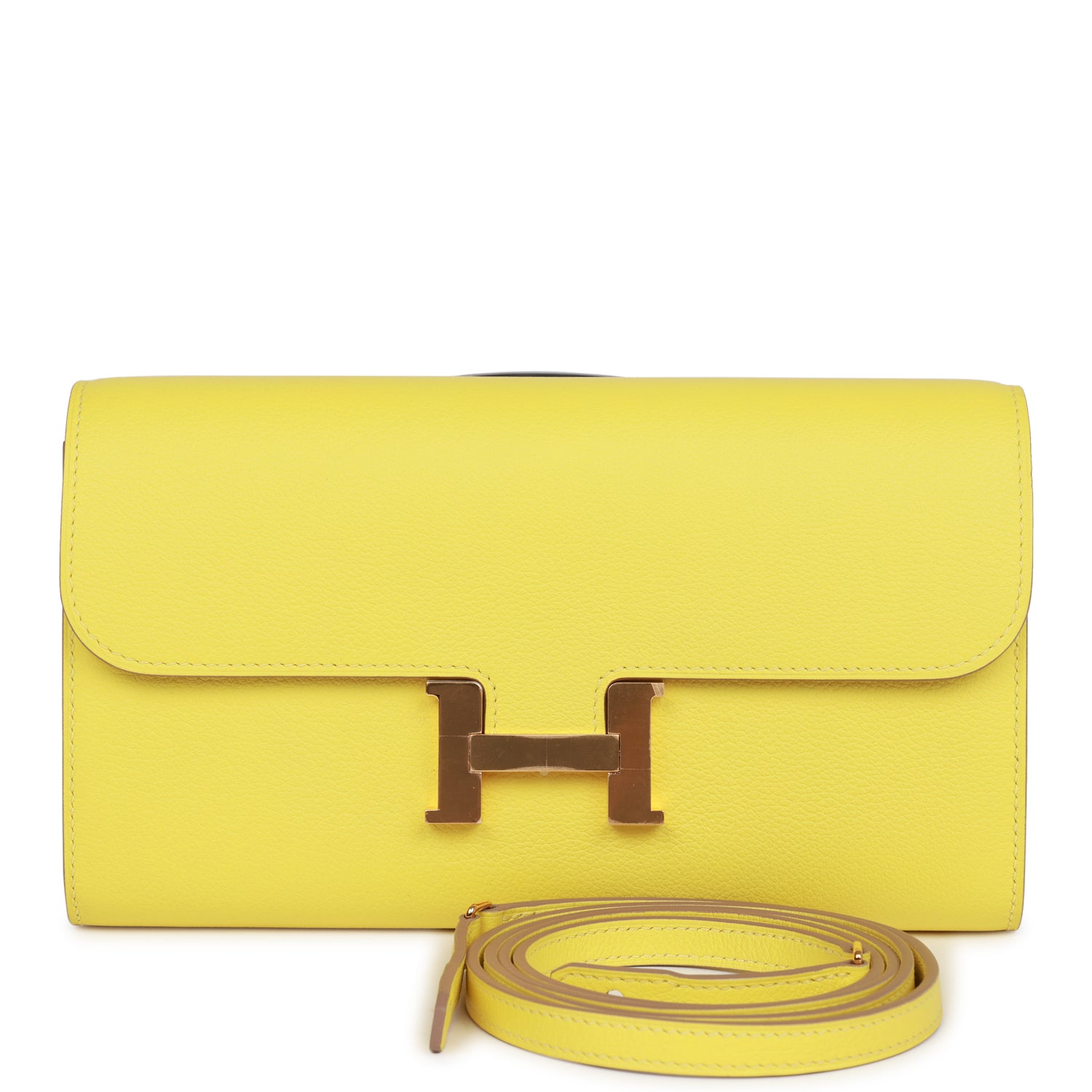 This Constance Wallet To Go is in Lime evercolor leather with gold hardware and has tonal stitching, metal "H" snap lock closure, open front compartment and removable crossbody strap.