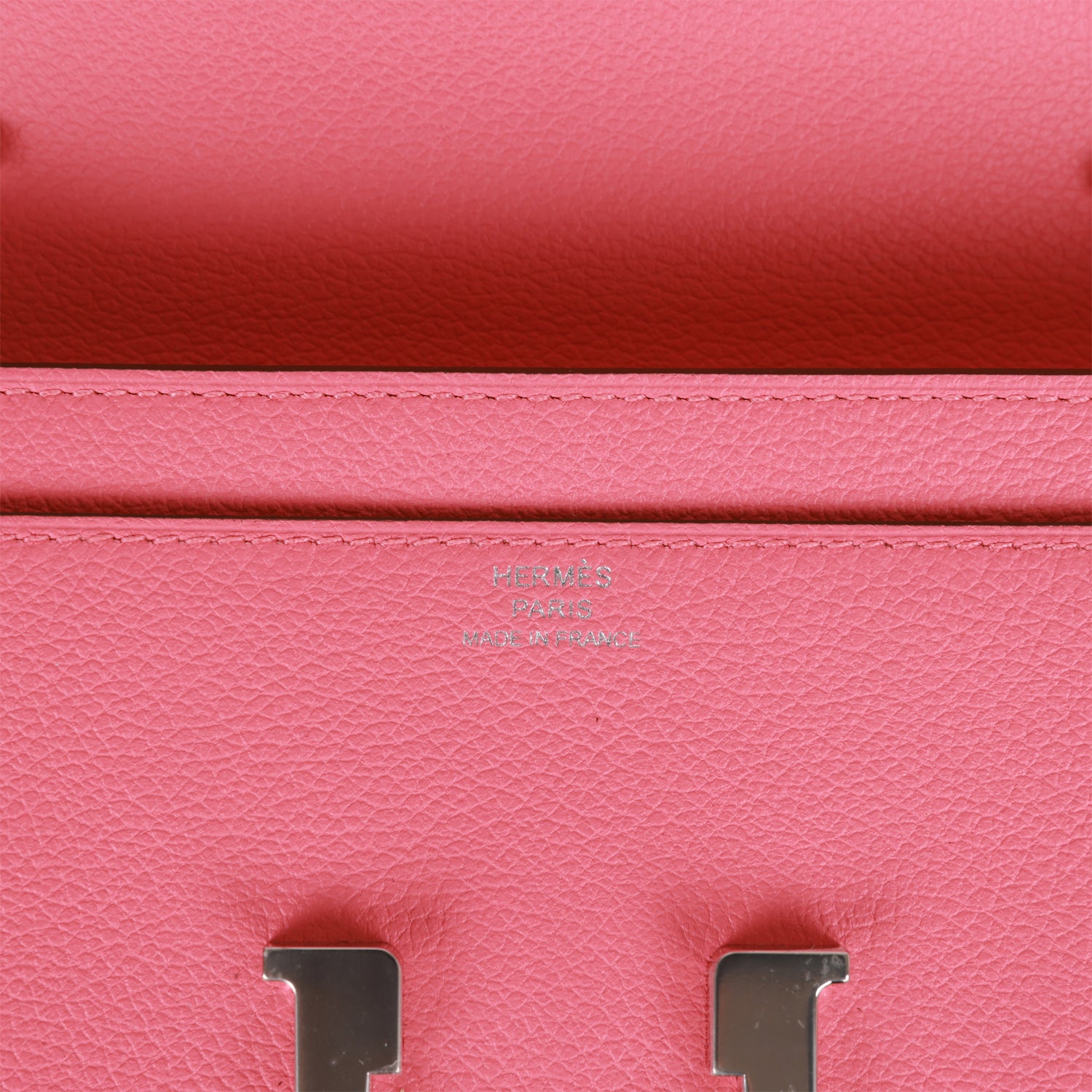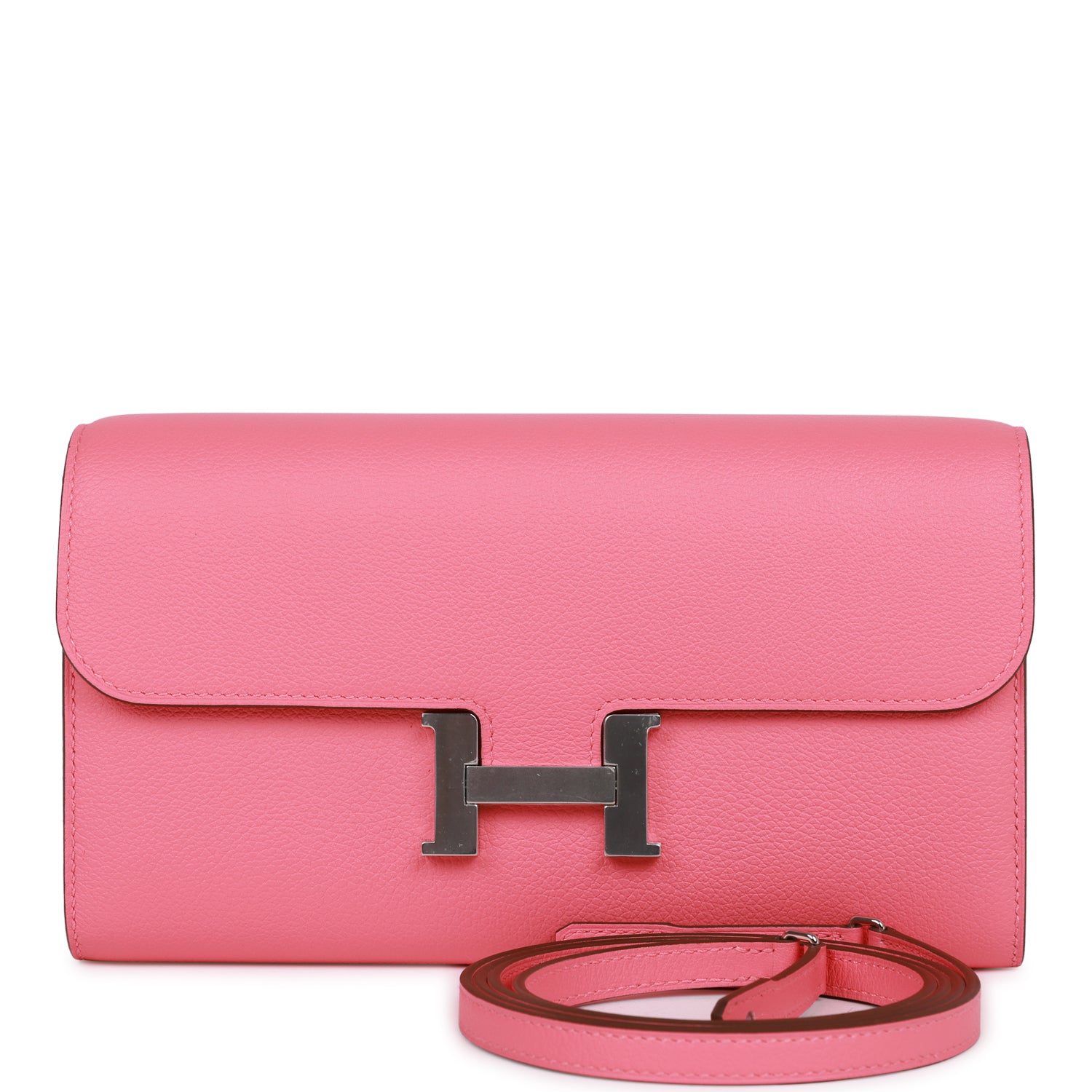 This Constance Wallet To Go is in Rose Azalee evercolor leather with palladium hardware and has tonal stitching, metal "H" snap lock closure, open front compartment and removable crossbody strap.