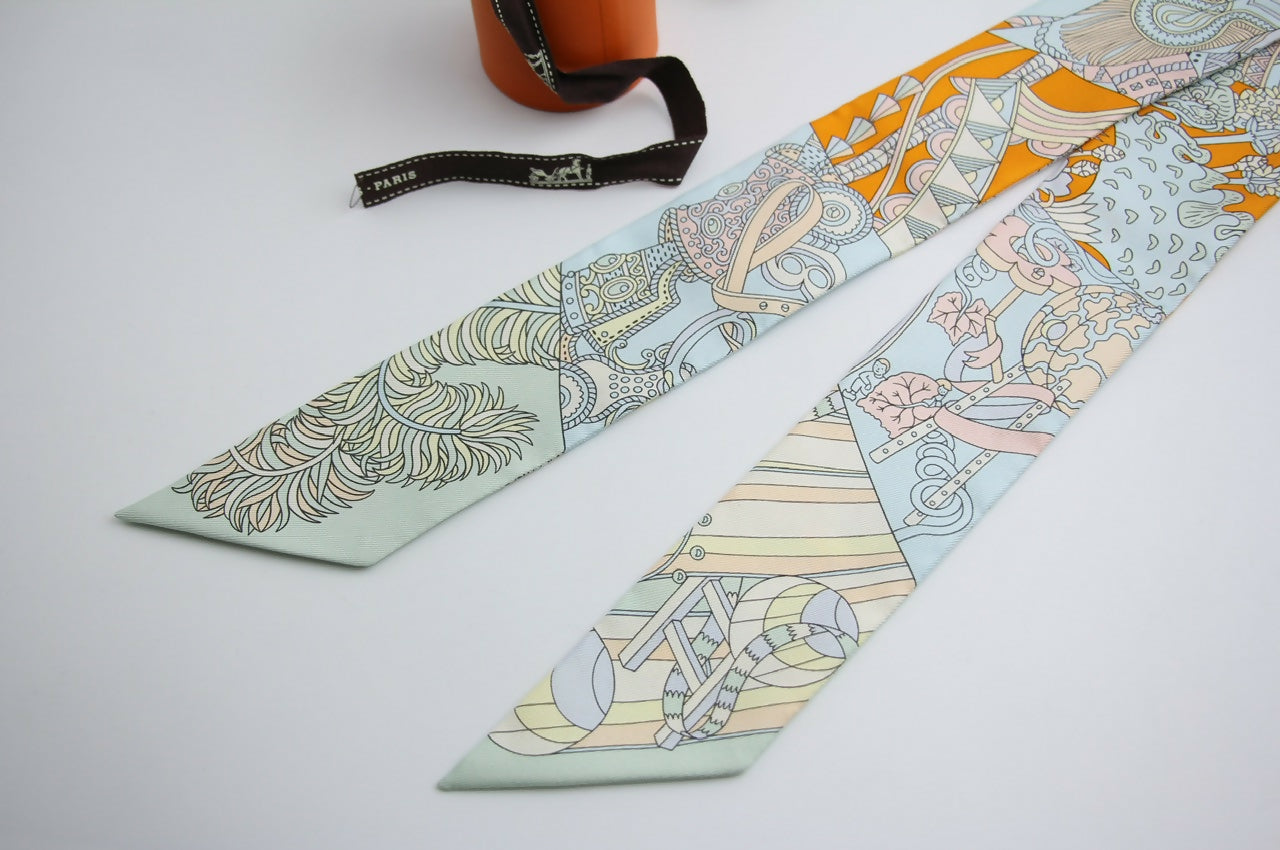 Expertly crafted by Hermes, the De l'Ombrelle aux Silk Twilly is a luxurious addition to any outfit. Made from premium silk, this pale pink and sky orange twilly will elevate your style with its elegant design. Perfect for adding a touch of sophistication to your look.