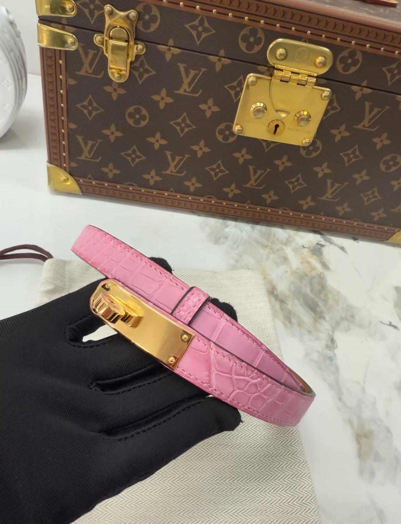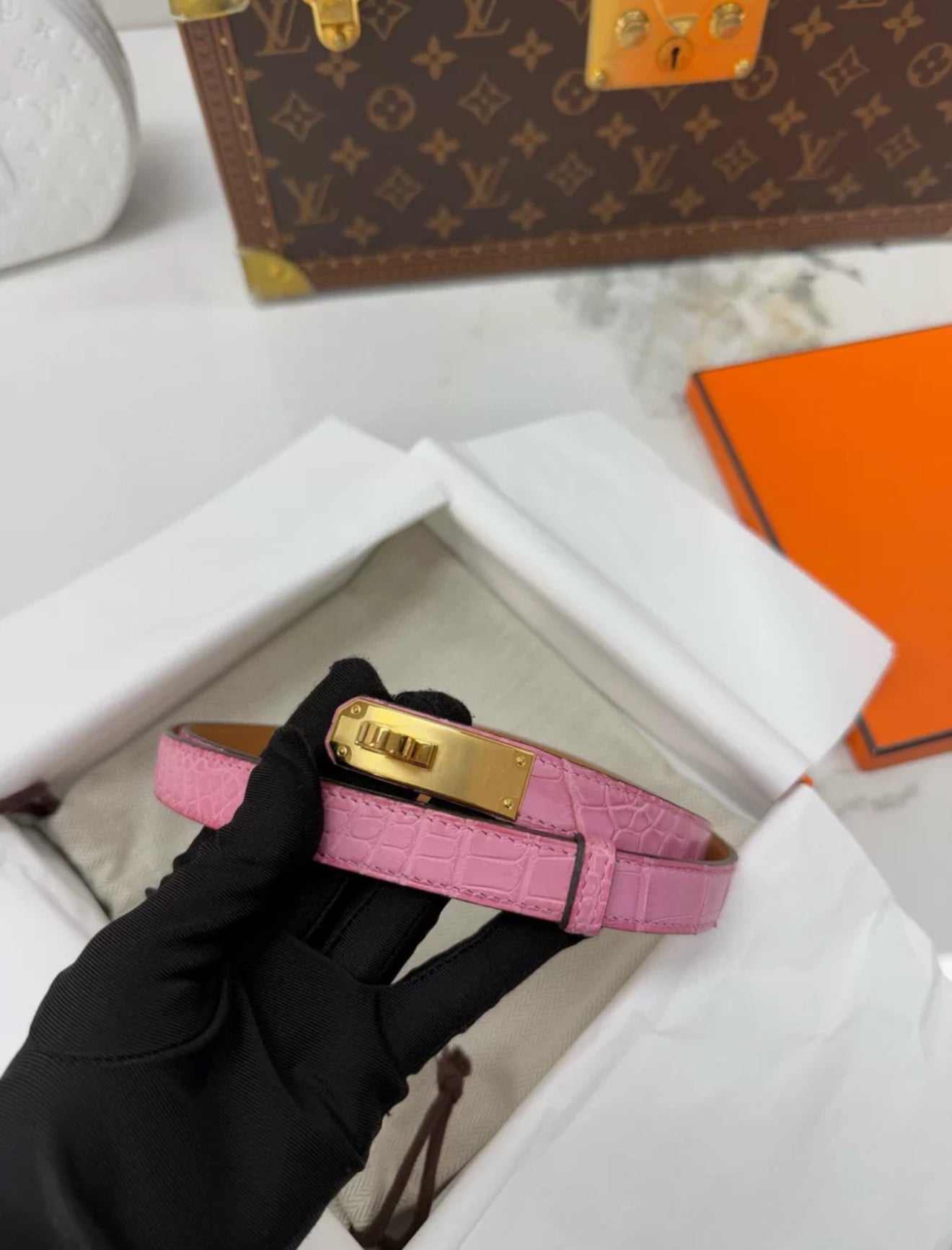 Hermès Kelly Belt Pink Crocodile leather Gold Hardware