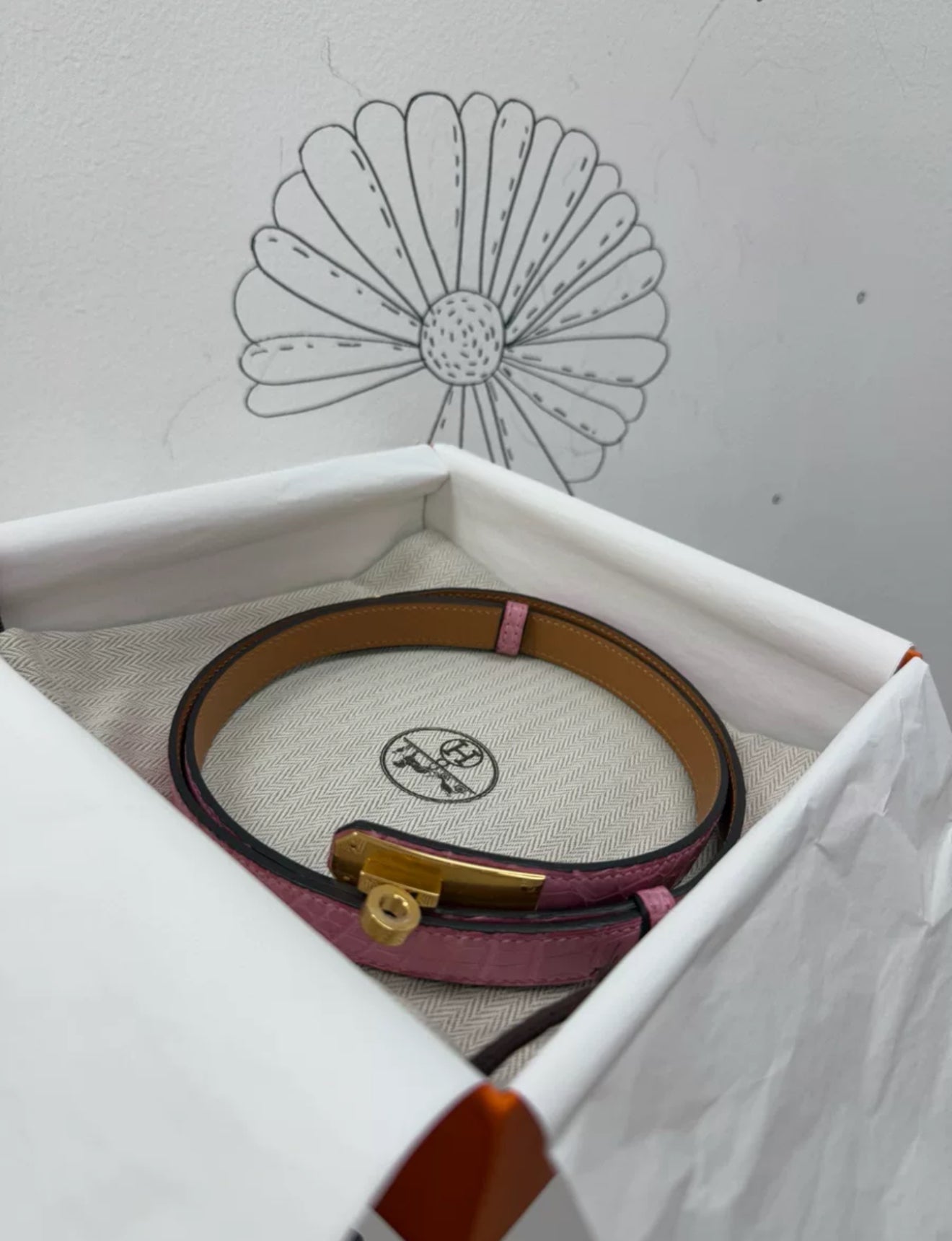 Expertly crafted from luxurious pink crocodile leather with gold hardware, the Hermès Kelly Belt is the ultimate statement accessory. In new condition, this belt exudes sophistication and elegance. Elevate any outfit with the timeless style and impeccable quality of this iconic piece.