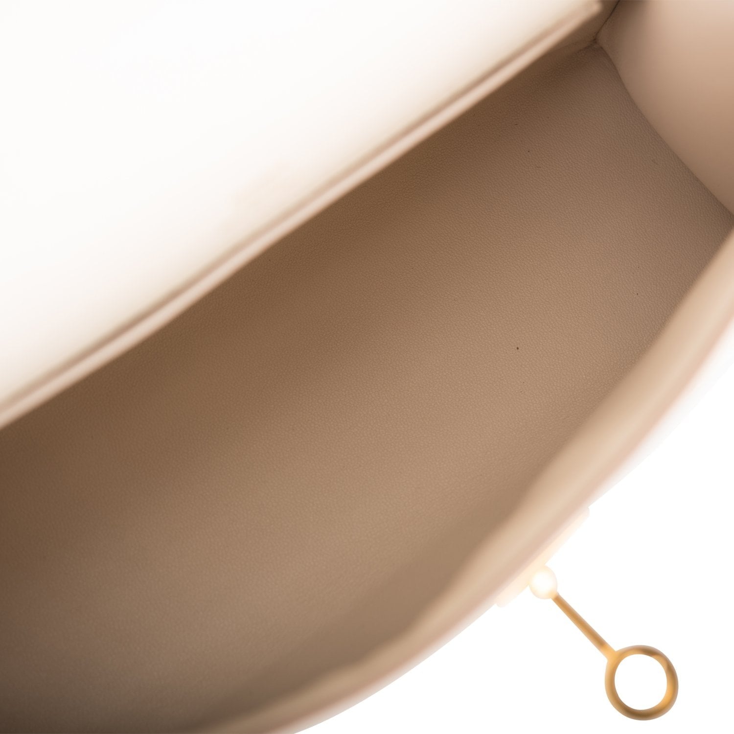This Mini Kelly Pochette is in Beton ostrich with gold hardware and has tonal stitching, front flap, two straps with center toggle closure and a top flat handle.