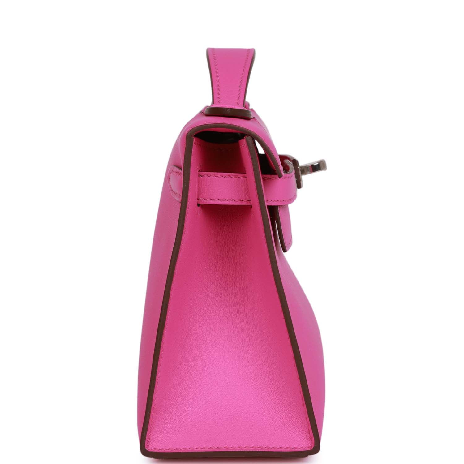This Mini Kelly Pochette is in Magnolia swift leather with palladium hardware and has tonal stitching, front flap, two straps with center toggle closure and a top flat handle.