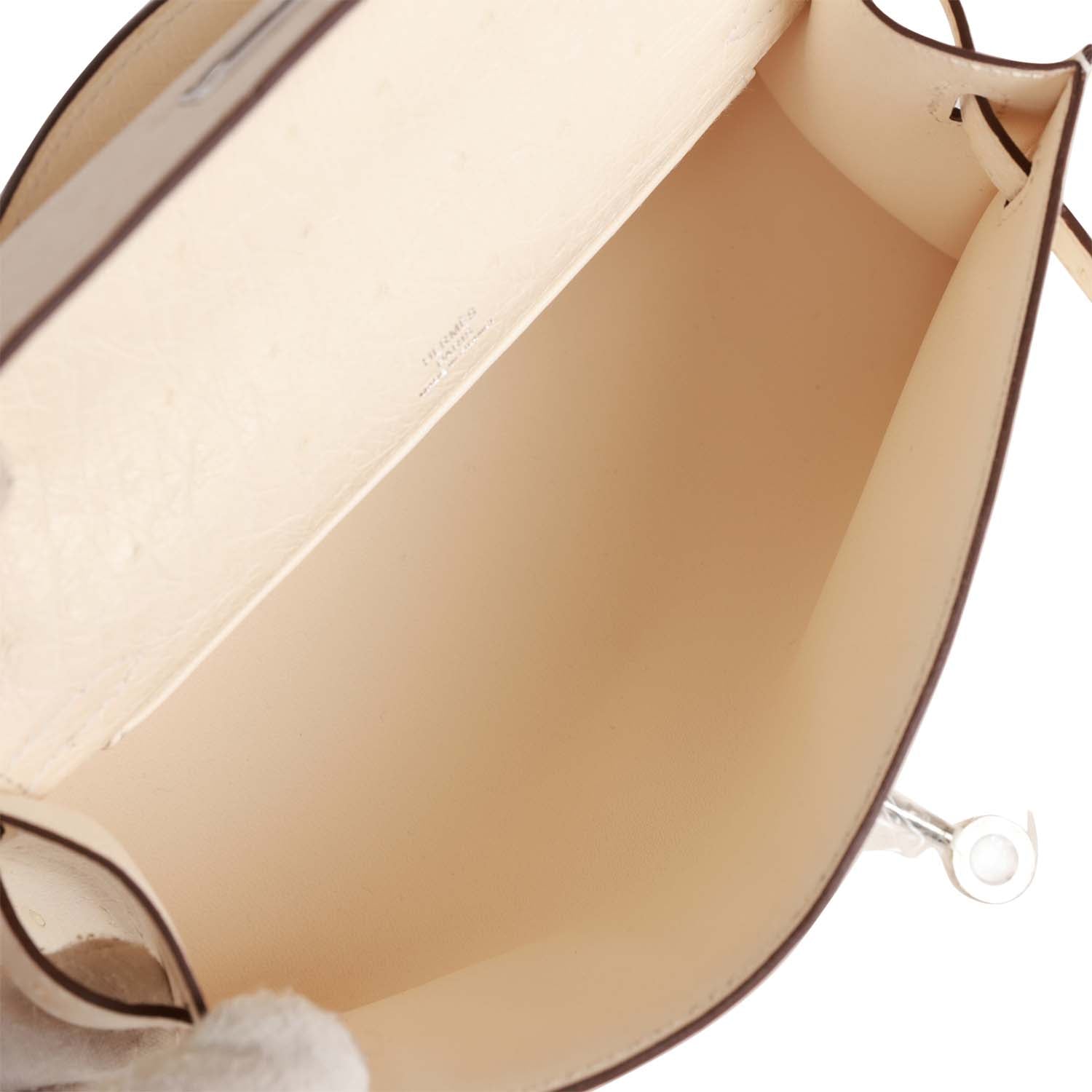 This Mini Kelly Pochette is in Nata ostrich with palladium hardware and has tonal stitching, front flap, two straps with center toggle closure and a top flat handle.