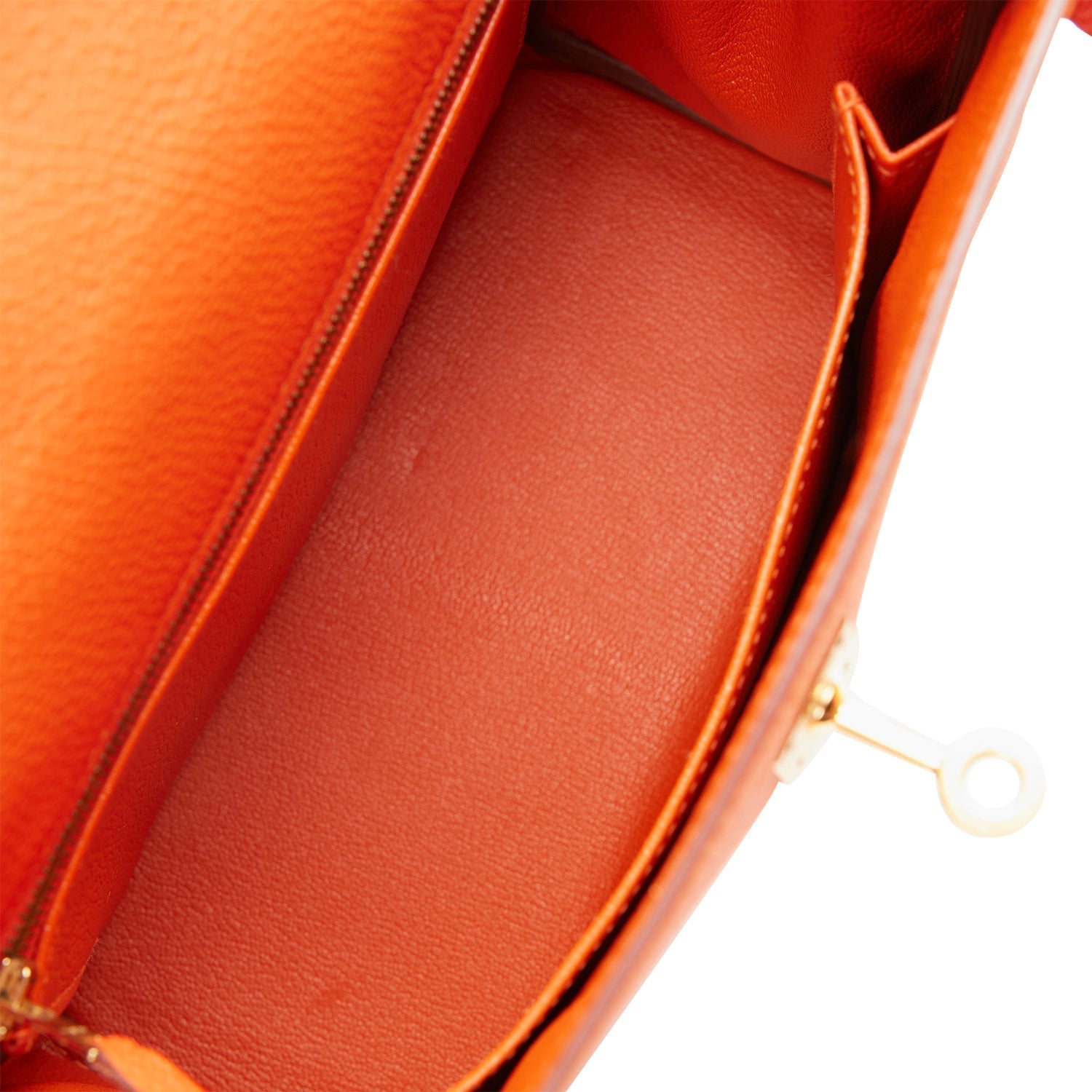This Retourne Kelly is of Feu togo leather with gold hardware and has tonal stitching, front flap, two straps with center toggle closure, clochette with lock and two keys, single rolled handle and an optional shoulder strap.