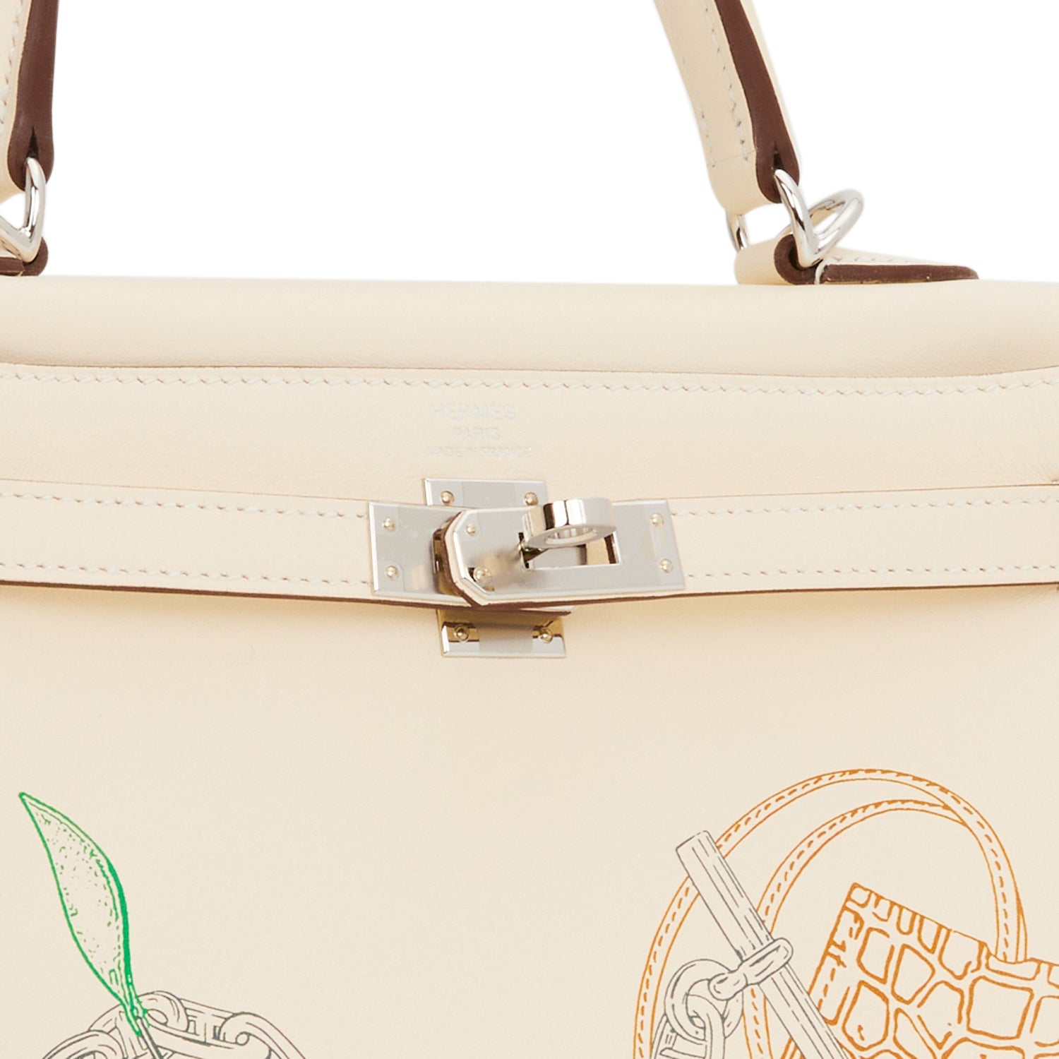 This Limited Edition Kelly, in the Retourne style, is in Nata swift leather with palladium hardware and has tonal stitching, front graphics of a rodeo charm, lipstick, pencil, coin purse and other small items found inside a bag, front flap, two straps with center toggle closure, clochette with lock and two keys, single rolled handle and removable shoulder strap.