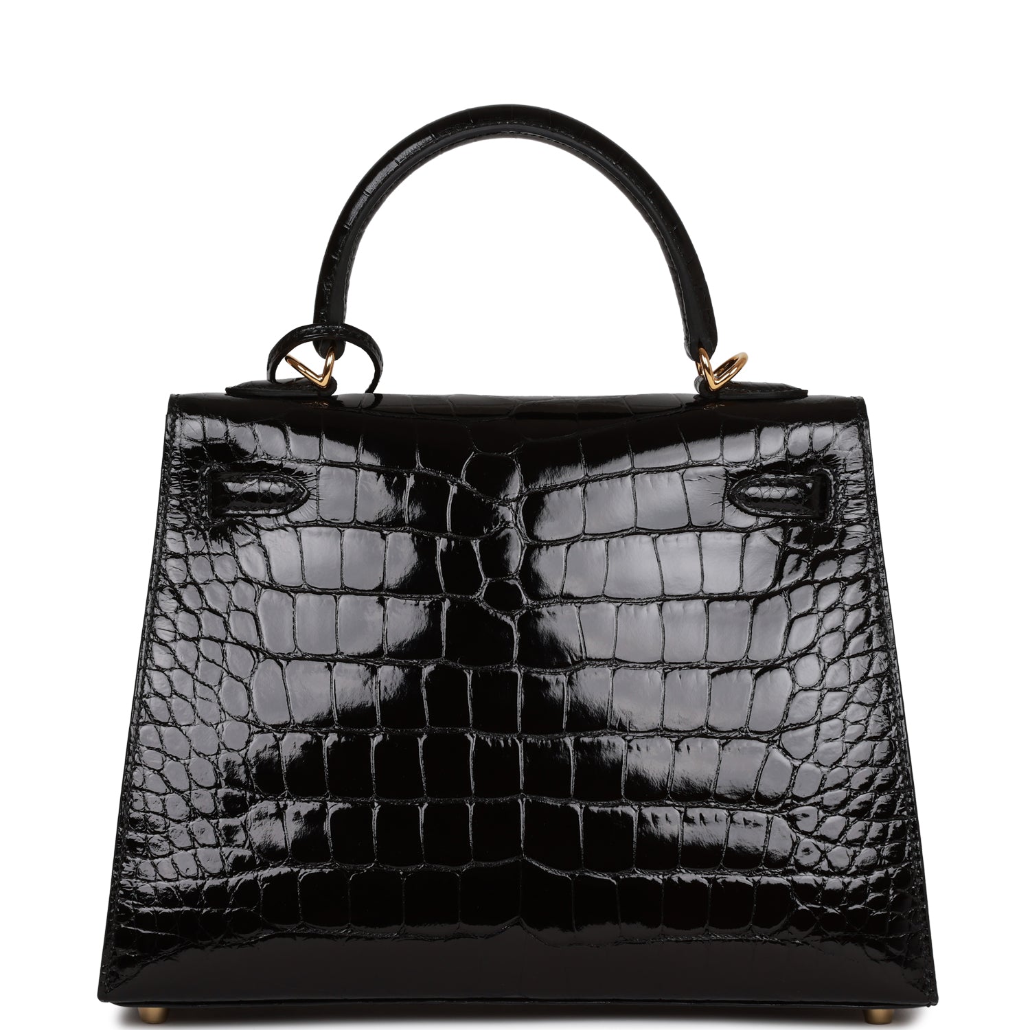 Hermes Kelly 25 Sellier Black Shiny Alligator Gold Hardware