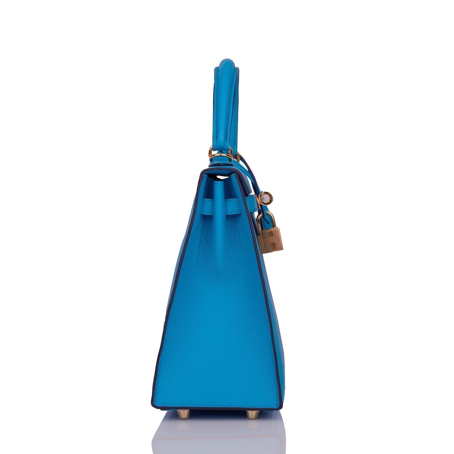 This Kelly, in the Sellier style, is in Bleu Frida epsom leather with gold hardware and has tonal stitching, two front straps with toggle closure, clochette with lock and two keys, single rolled handle and removable shoulder strap.