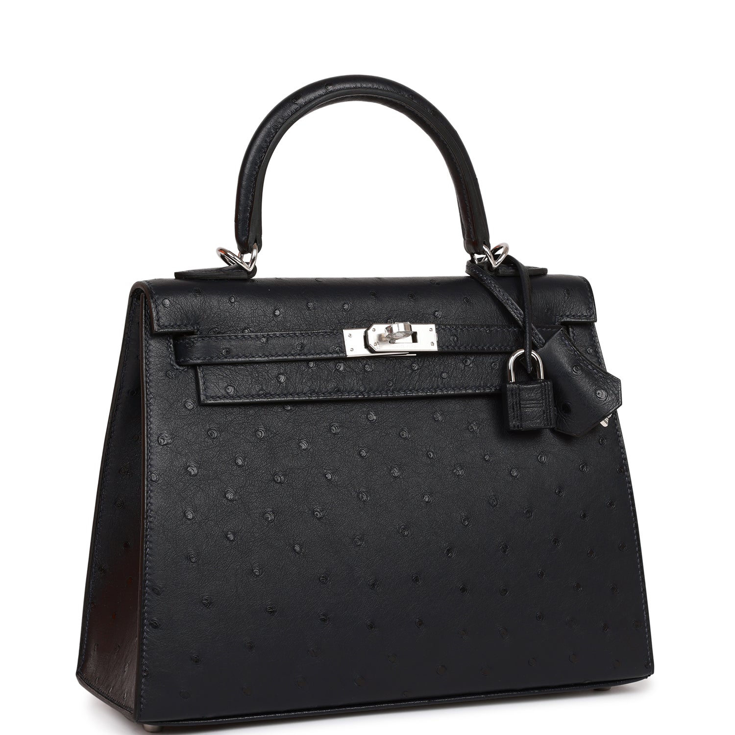This Kelly, in the Sellier style, is in Caban Ostrich with palladium hardware and has tonal stitching, two straps with front toggle closure, clochette with lock and two keys, single rolled handle and removable shoulder strap.