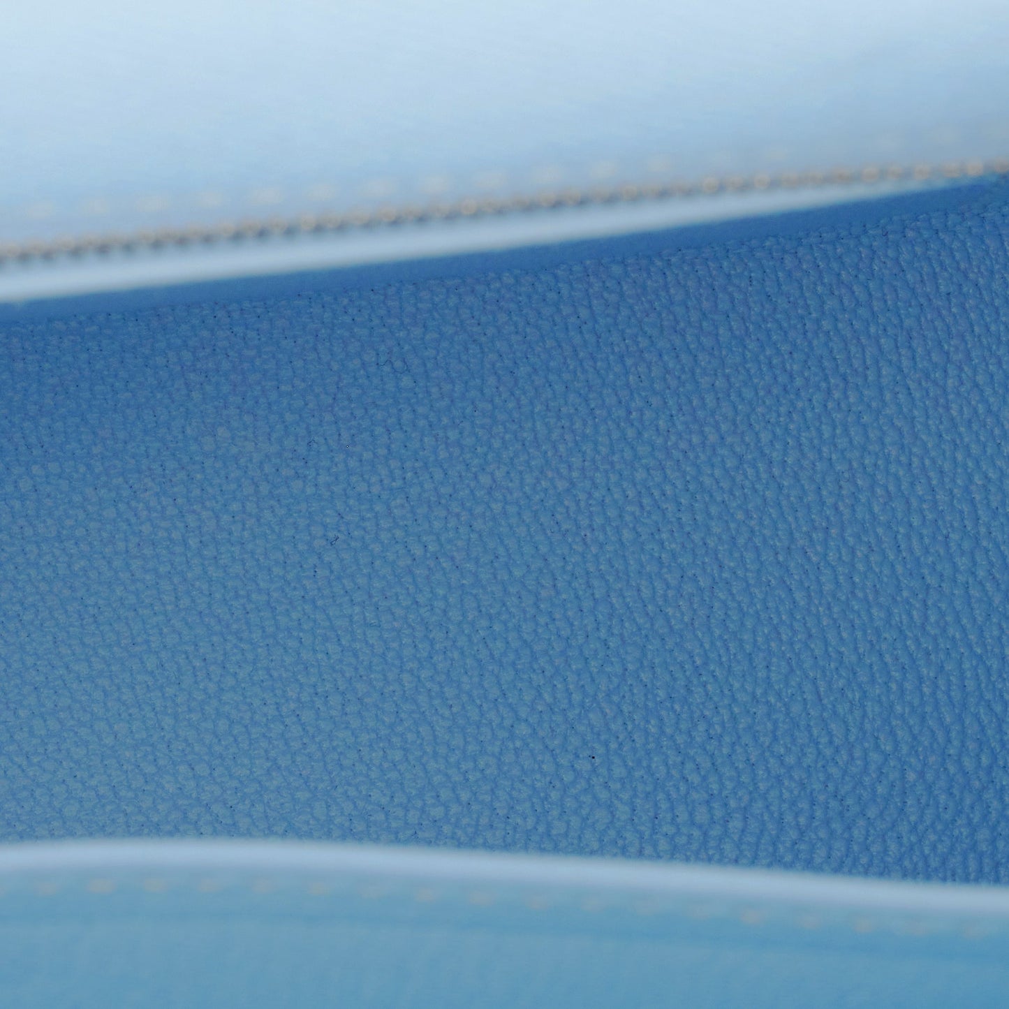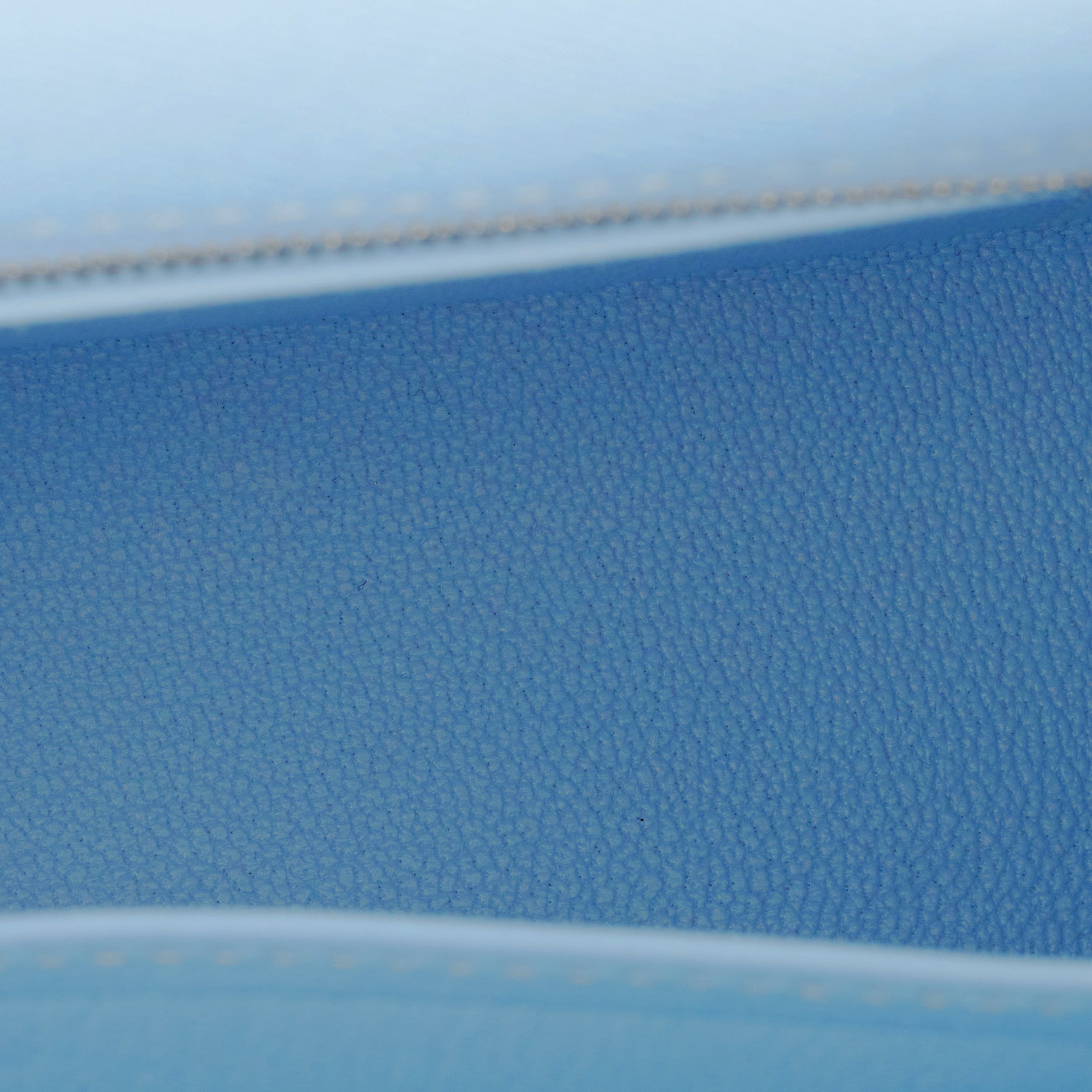 The interior is lined with Bleu Brume chevre leather and has one zip pocket with an Hermes engraved pull and one open pocket on the opposite side.