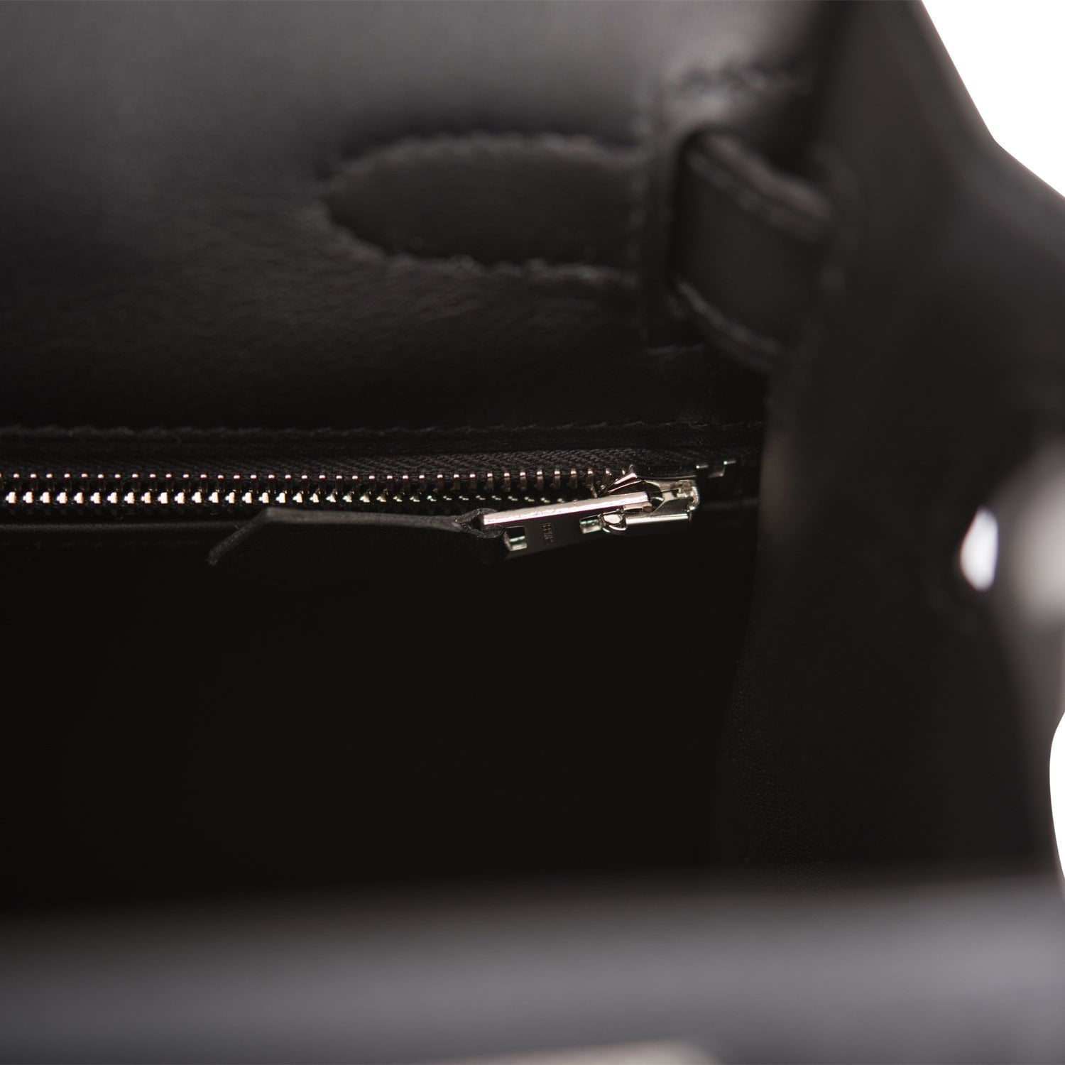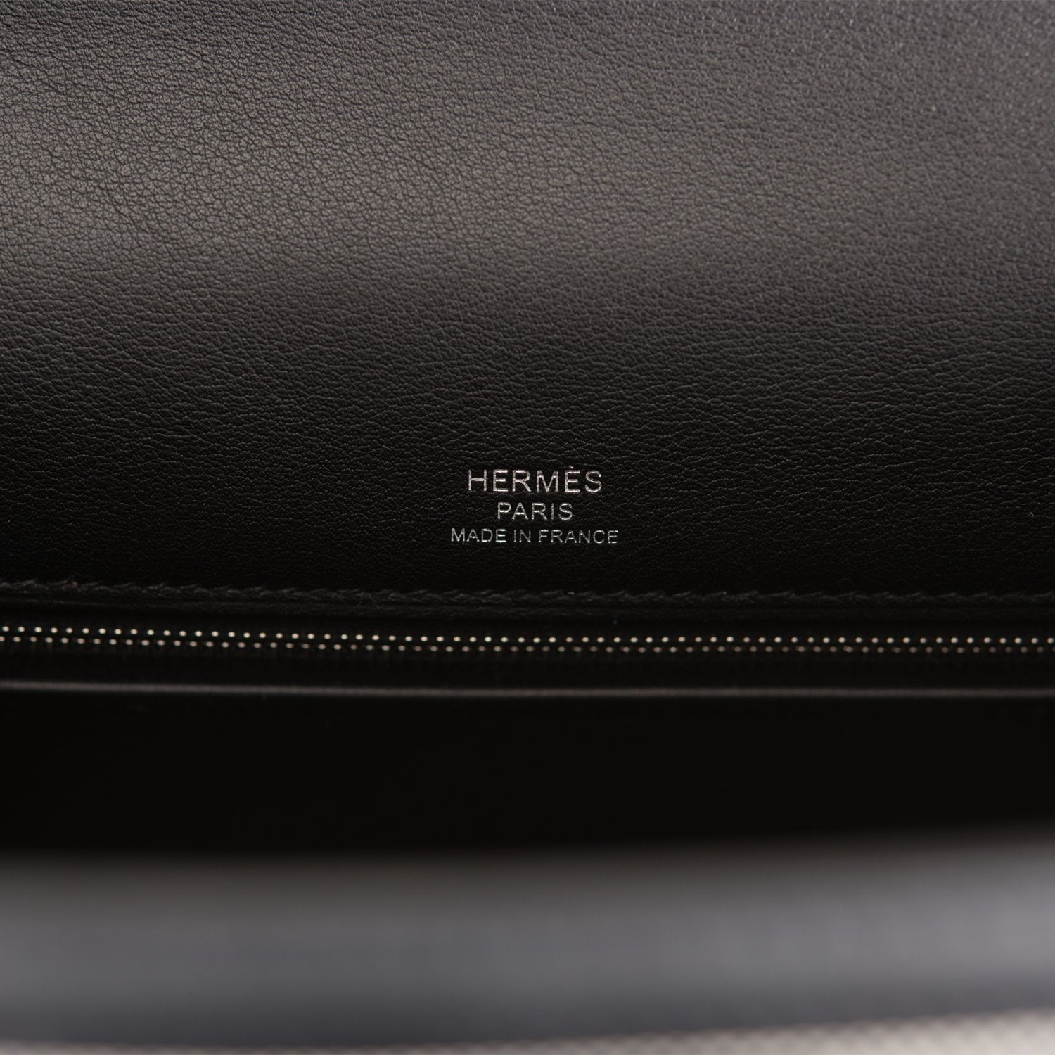The interior is lined with black swift and has one zip pocket with an Hermes engraved pull and two open pockets on the opposite side.