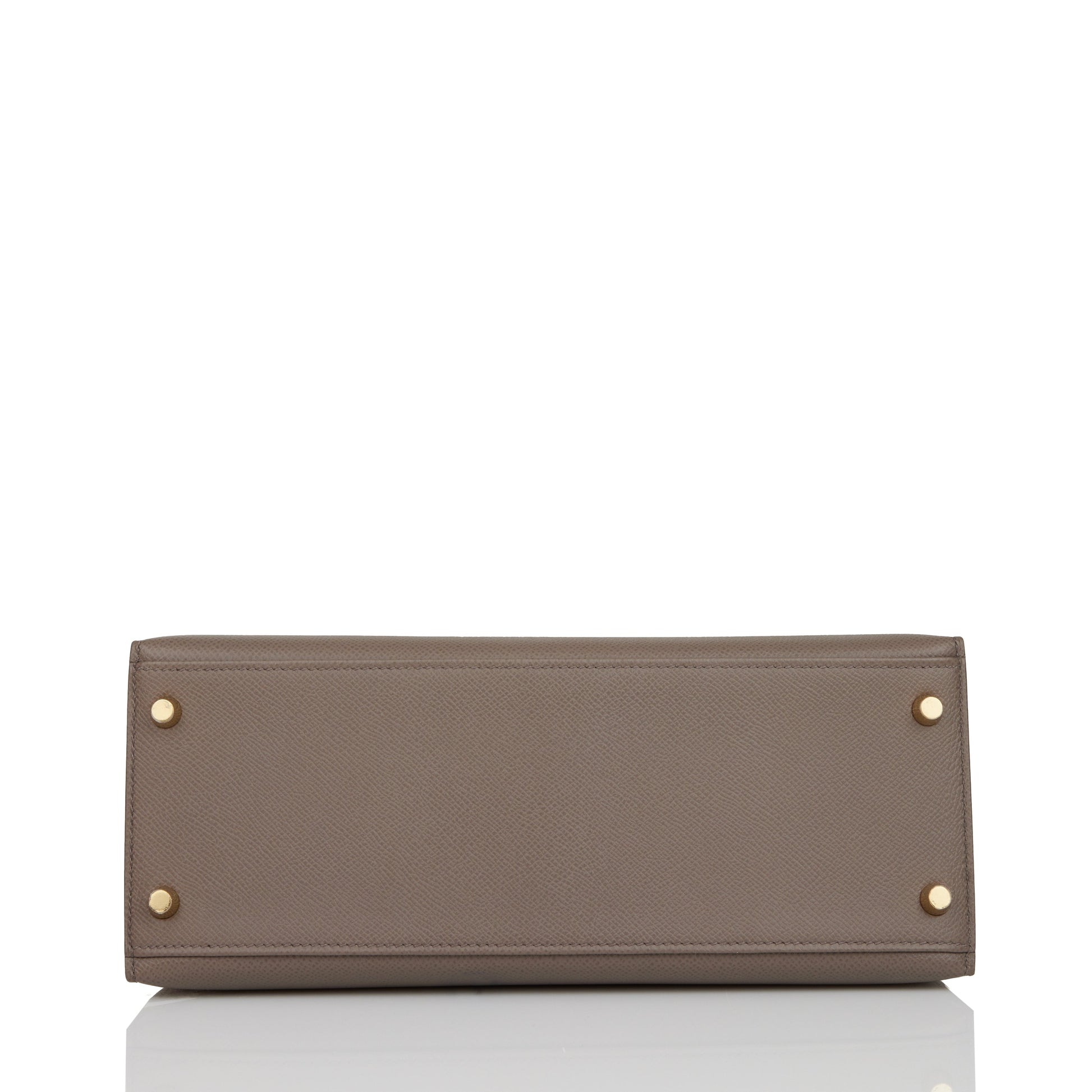 This Kelly, in the Sellier style, is in Etain epsom leather with gold hardware and has tonal stitching, front flap, two straps with center toggle closure, clochette with lock and two keys a single rolled handle and removable shoulder strap.
