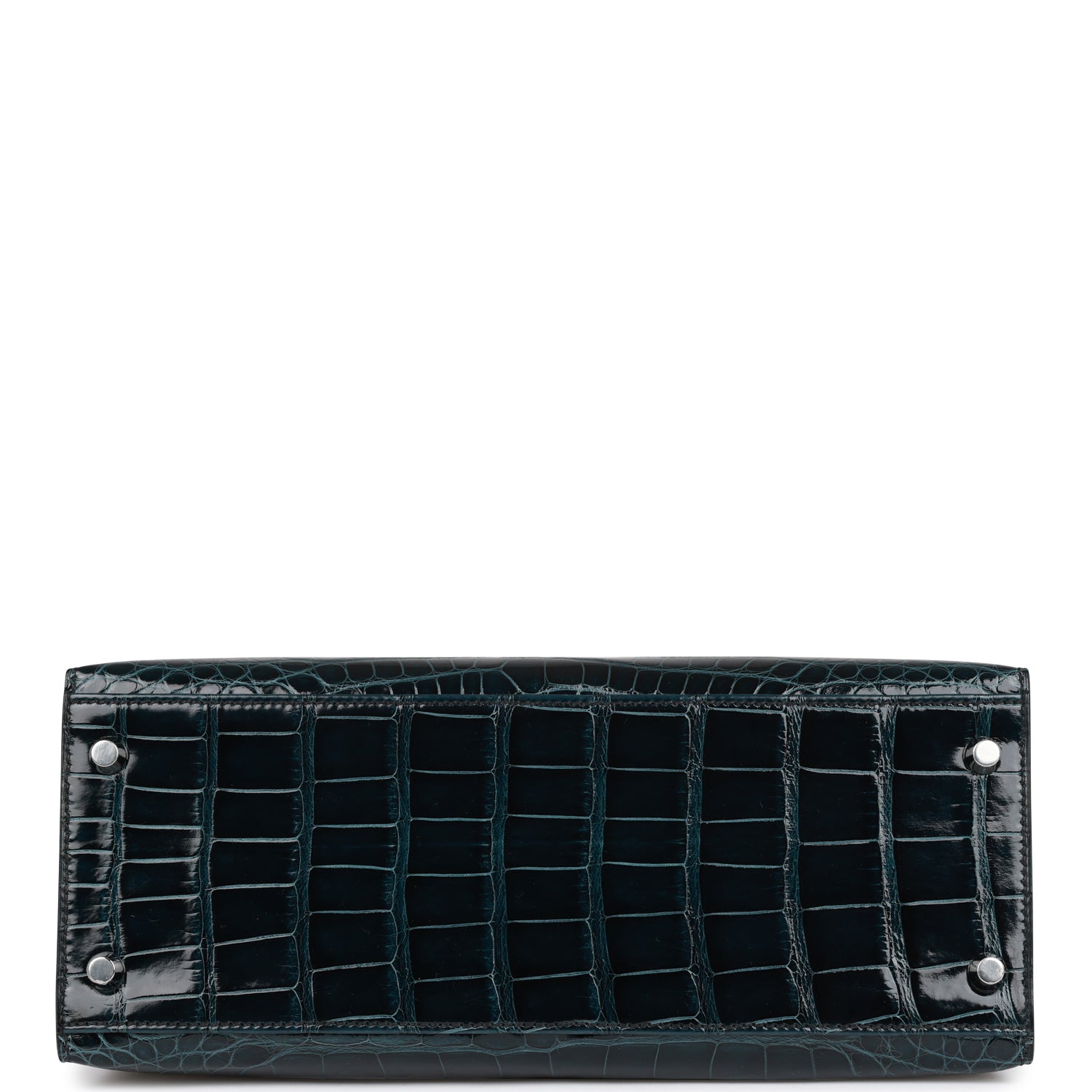 This rare Kelly, in the Sellier style, is of Vert Rousseau, Vert Bosphore and Black shiny and matte Mississippiensis alligator with palladium hardware and features tonal stitching, a front toggle closure, a clochette with lock and two keys and a single rolled handle.