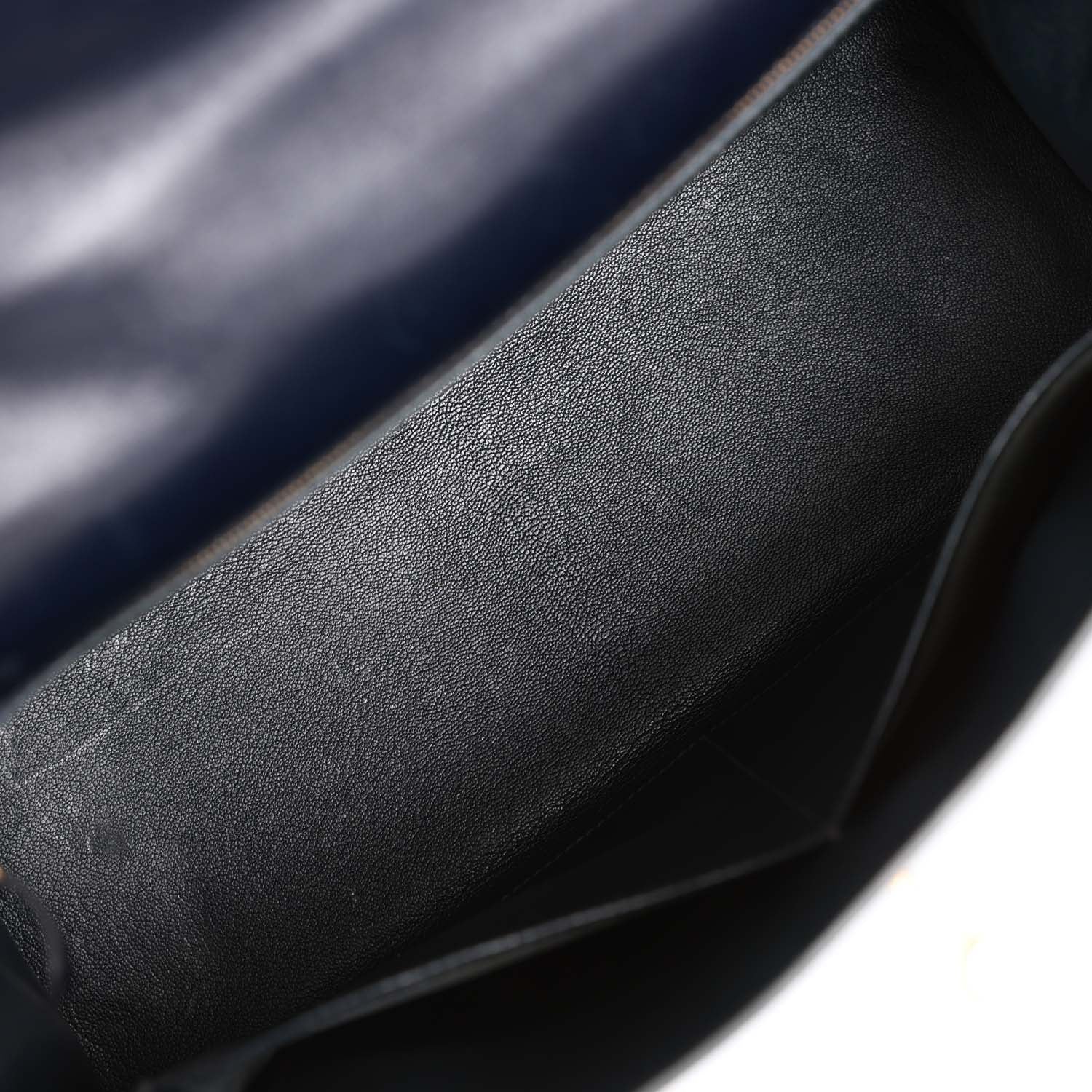 This Kelly 32 is in navy boxcalf leather with gold hardware, has tonal stitching, a front toggle closure, a clochette with lock and two keys and a single rolled handle.