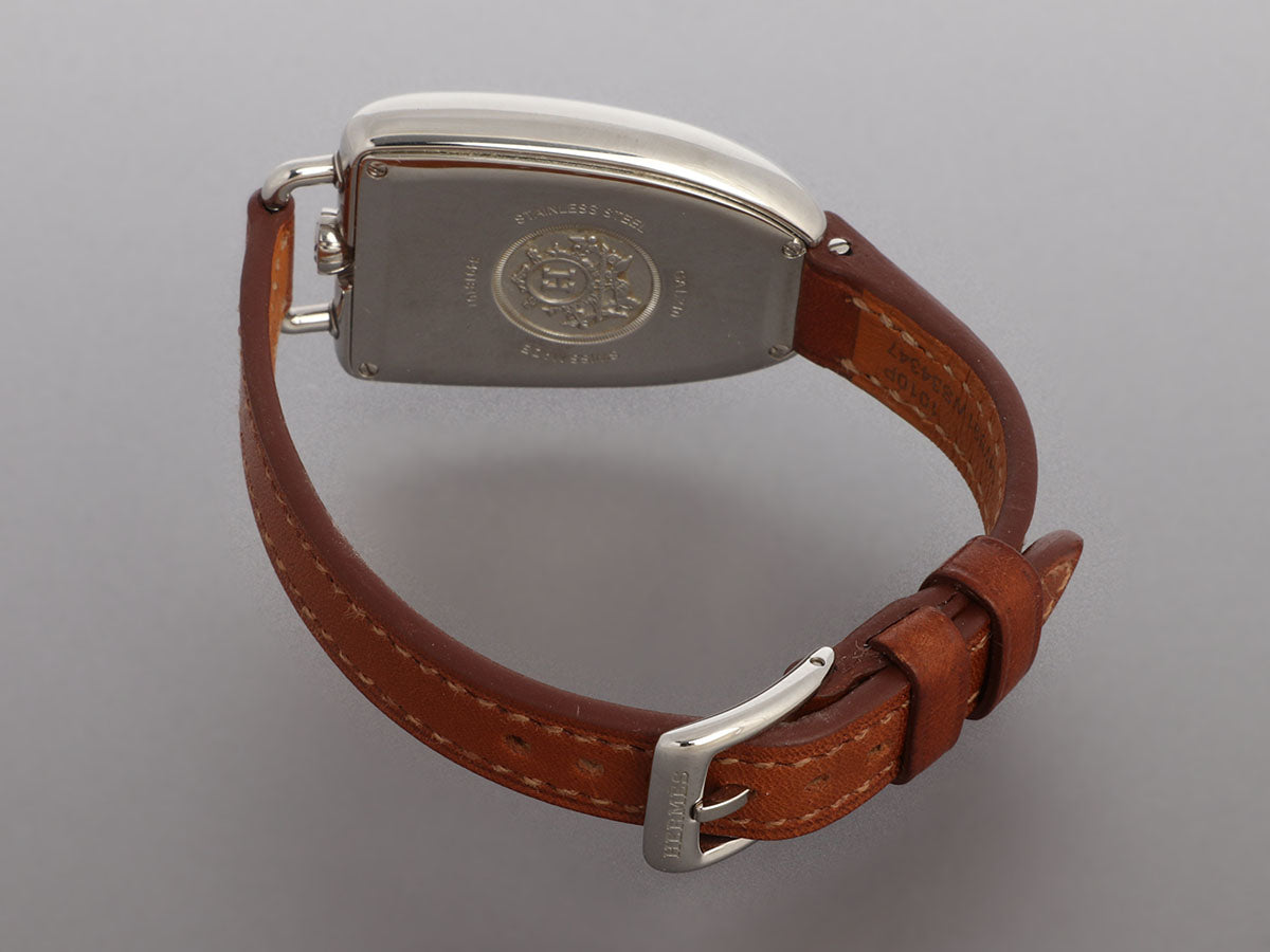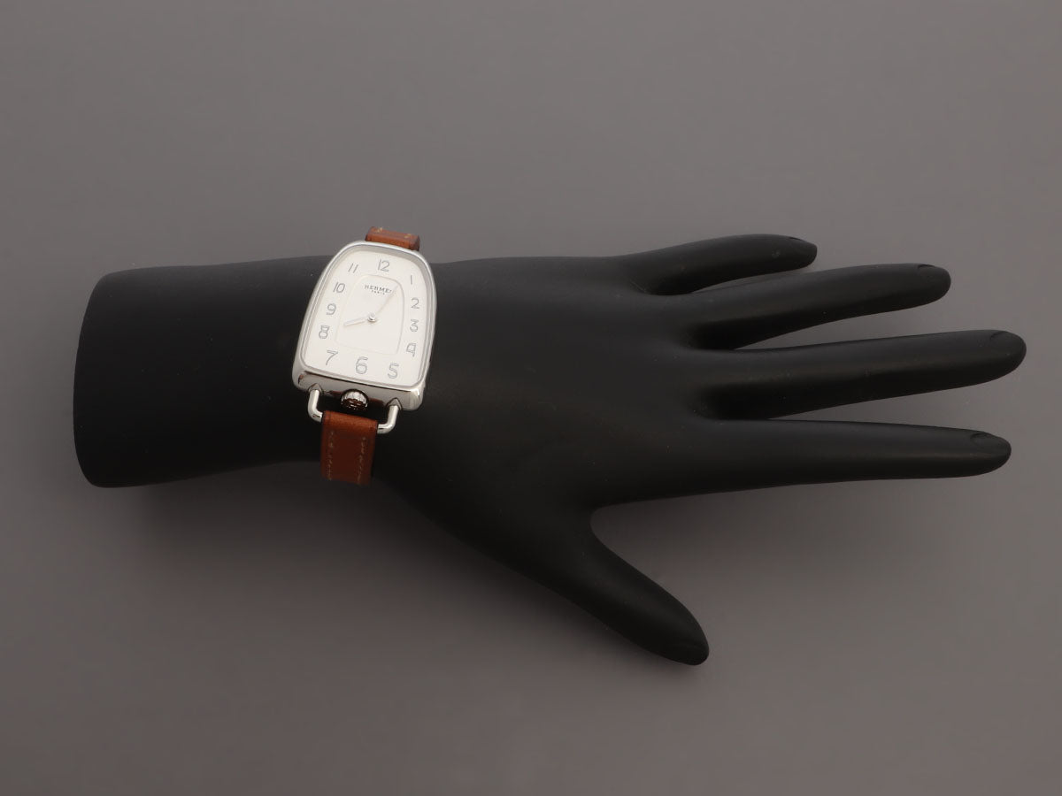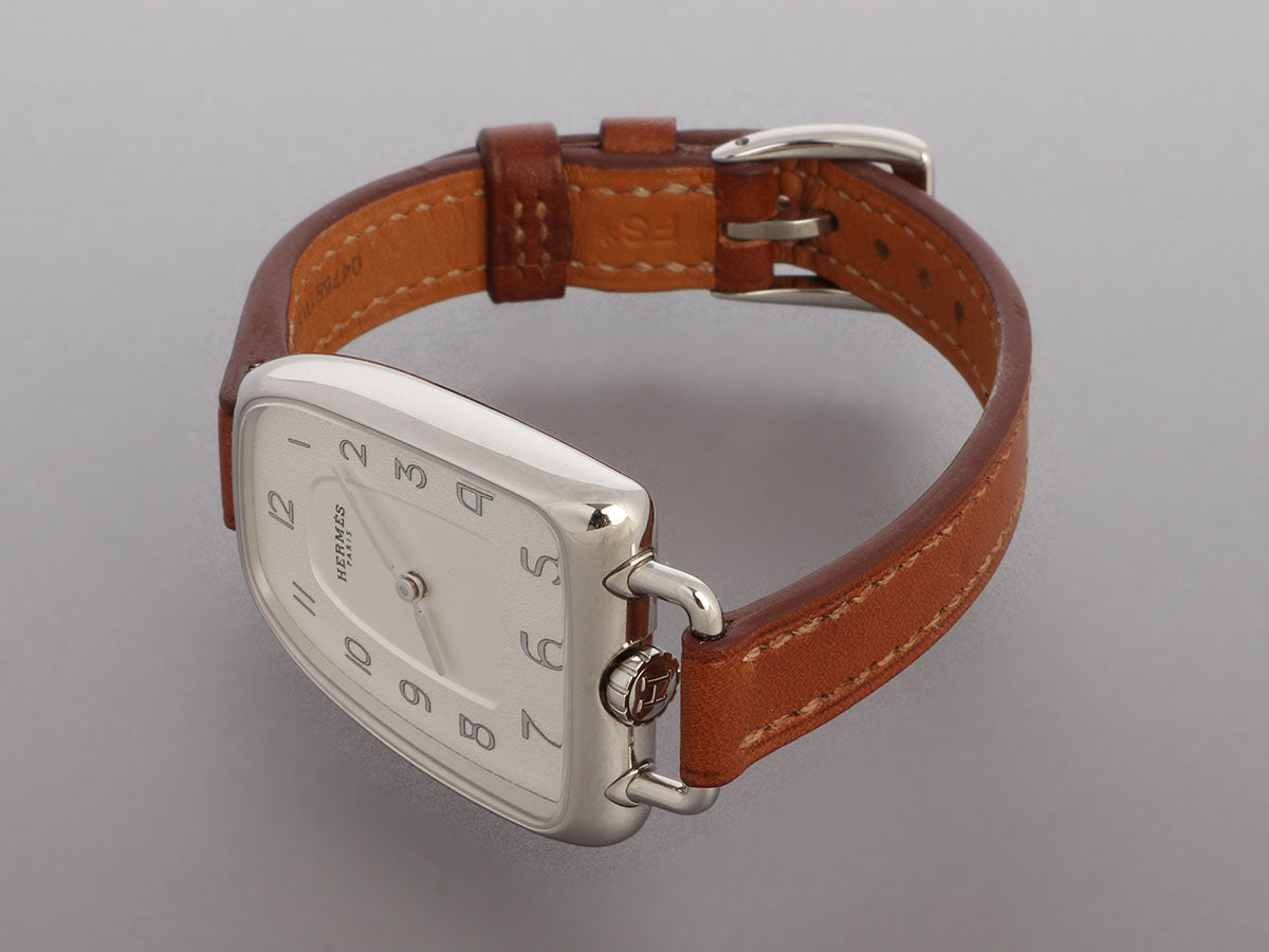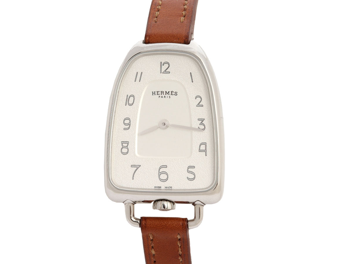 Hermès’ Medium Galop Watch 32mm is a sleek, equestrian-inspired timepiece shaped like a stirrup! Crafted from stainless steel, this Swiss-made watch features quartz movement and a brown Barenia leather strap. In very good condition, it has marks on the metal, but it’s still ready to ride!