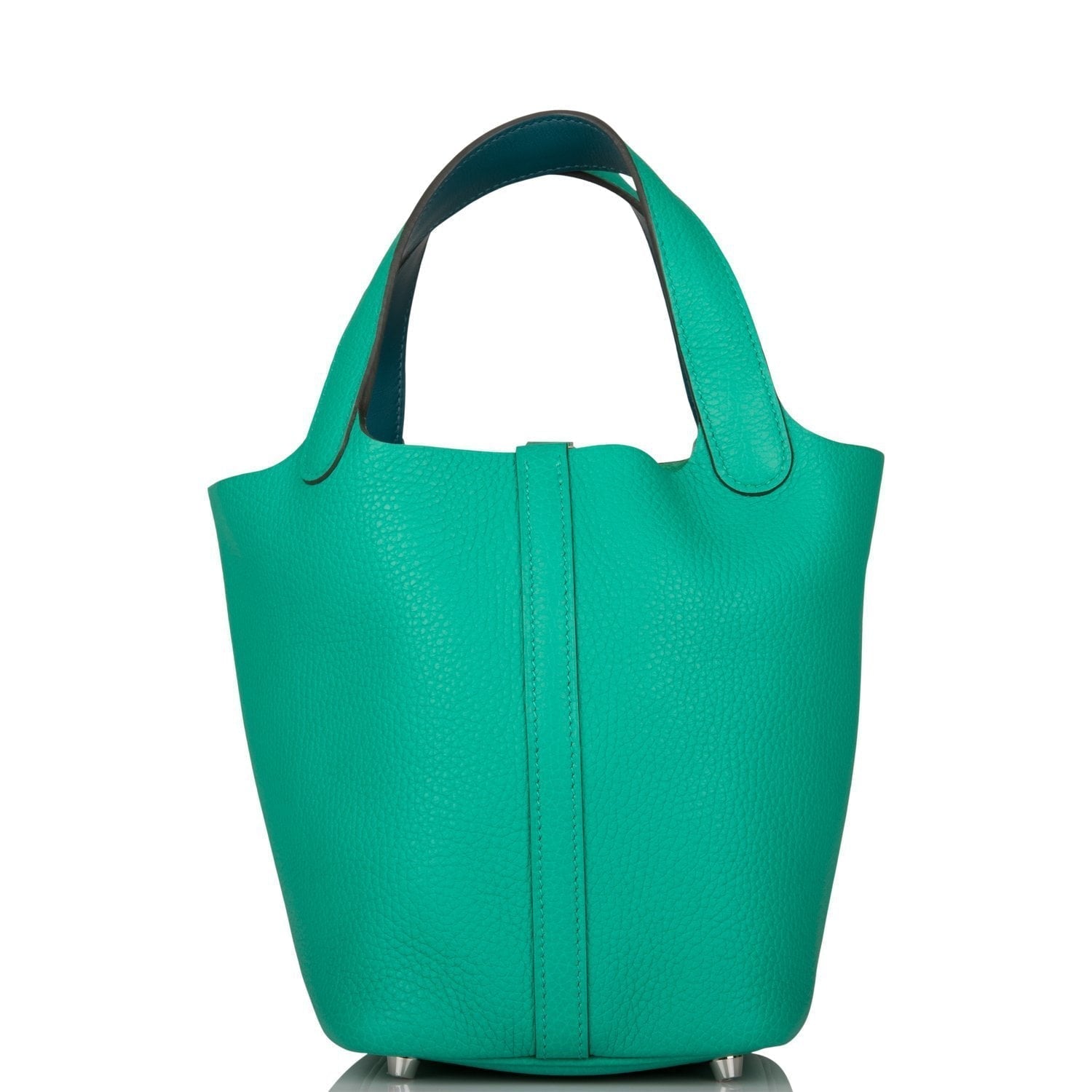 This Picotin Lock is in Menthe clemence leather with palladium hardware and has tonal stitching with two top handles.
