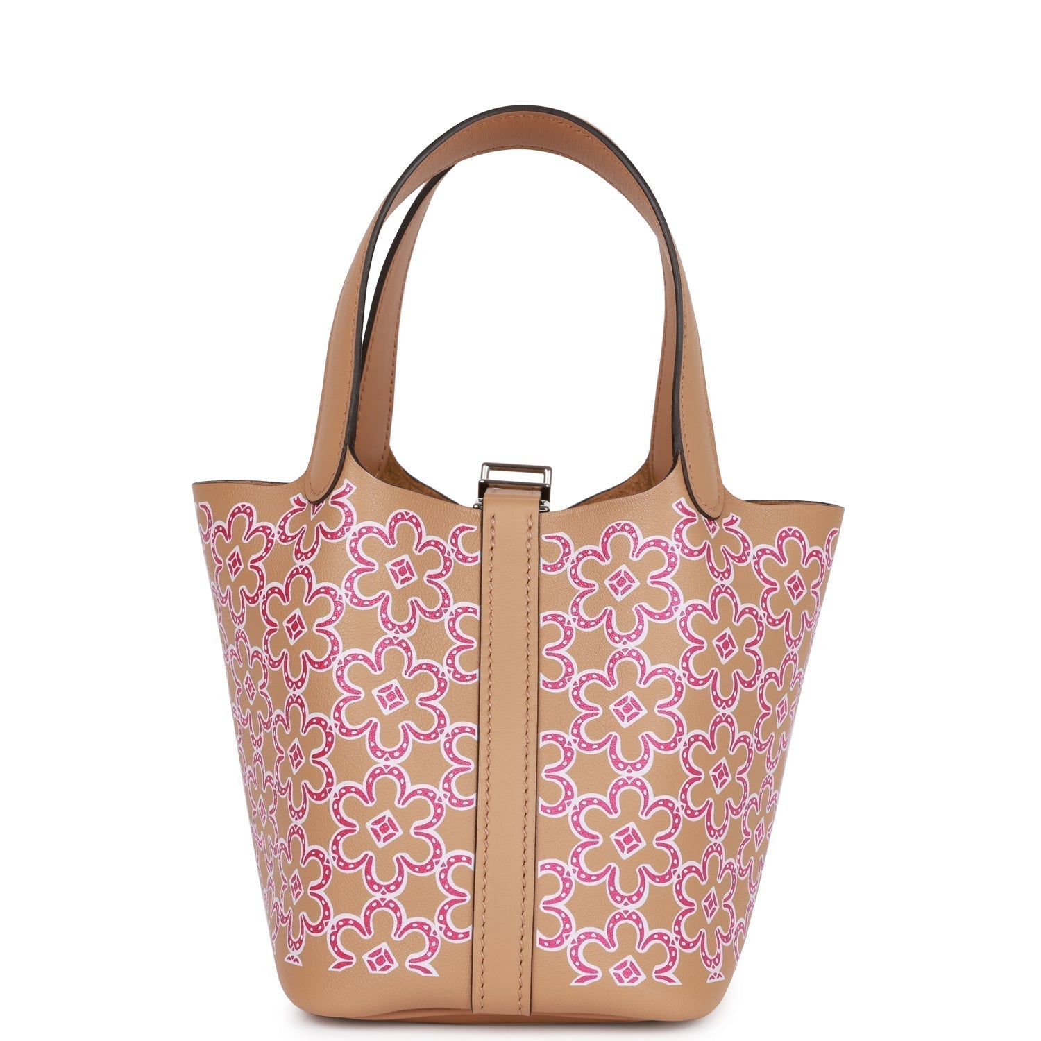 This limited edition "Lucky Daisy" Picotin Lock is in Chai swift leather with palladium hardware and has tonal stitching with two top handles.