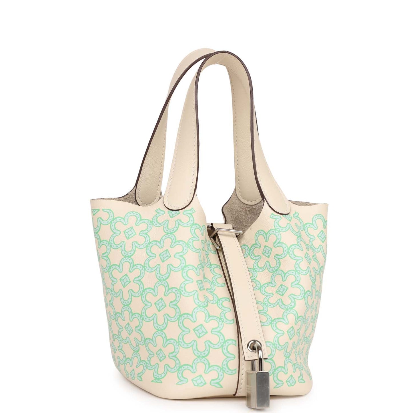 This limited edition "Lucky Daisy" Picotin Lock is in Nata swift leather with palladium hardware and has tonal stitching with two top handles.