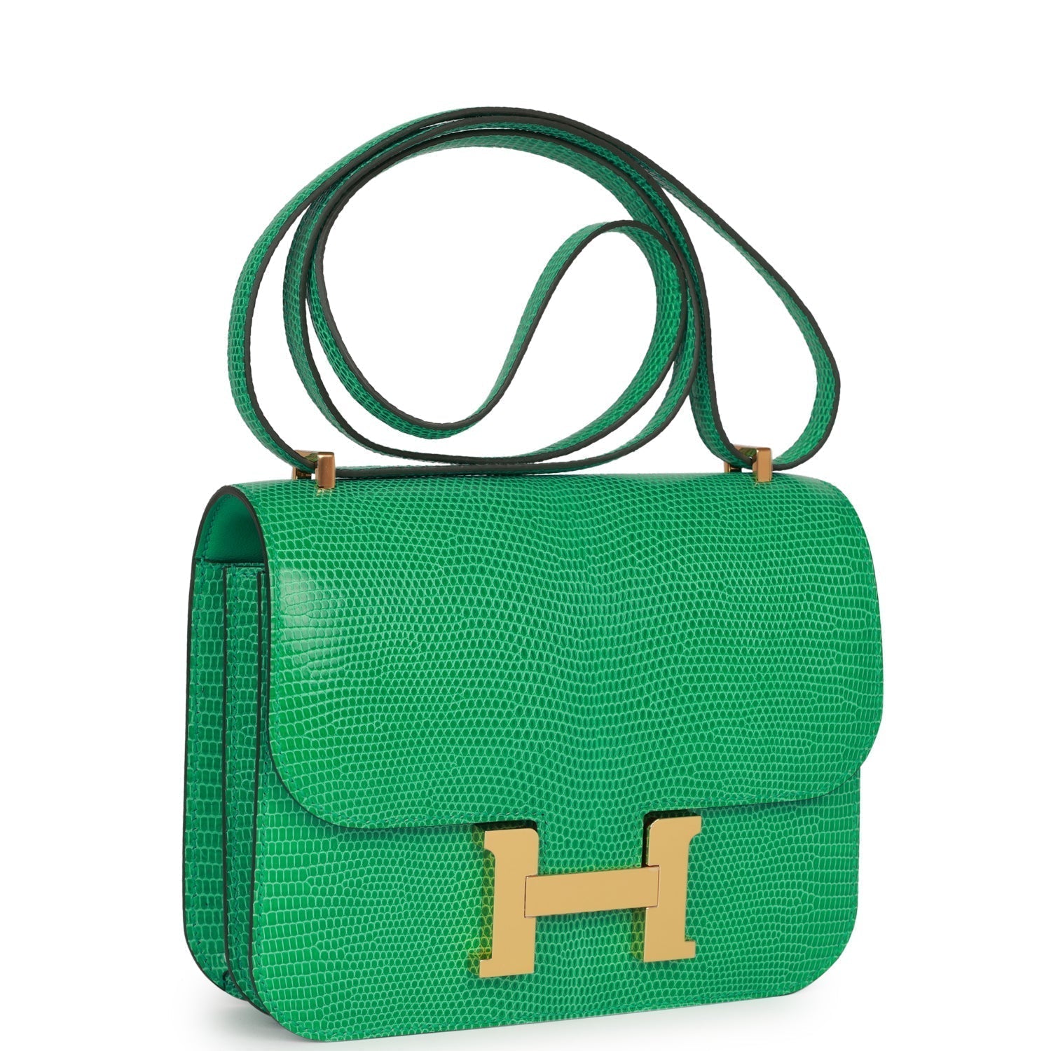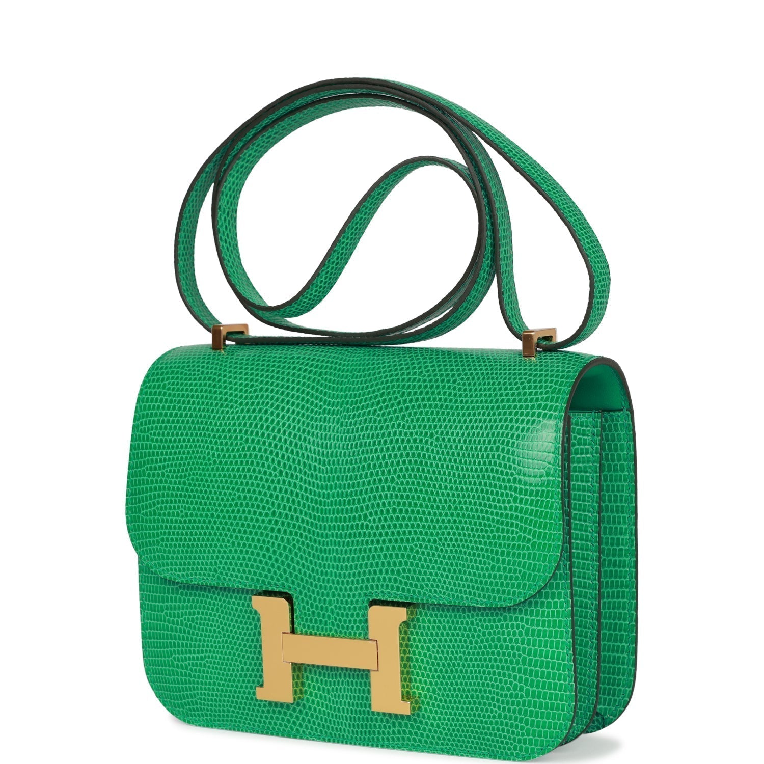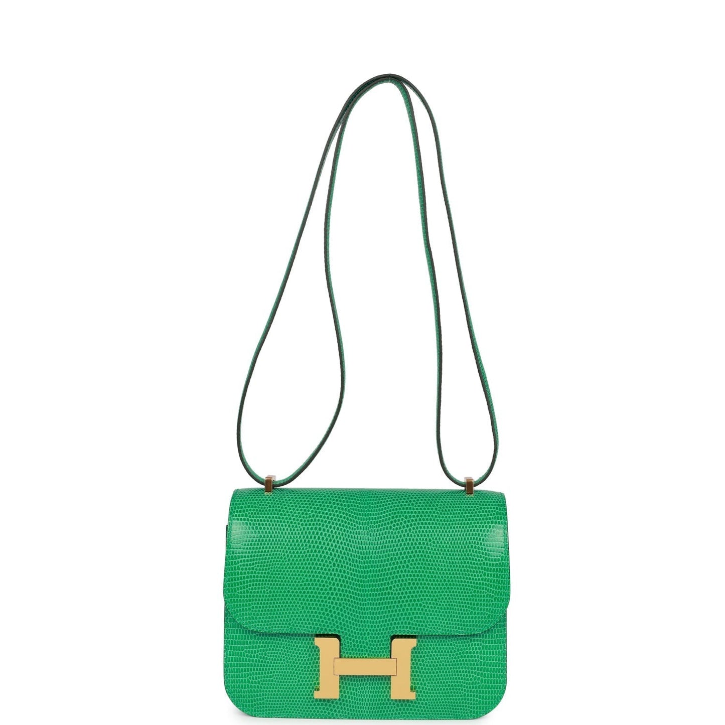 This Mini Constance is in Menthe salvator lizard with gold hardware and has tonal stitching, gold "H" snap lock closure and adjustable shoulder strap.