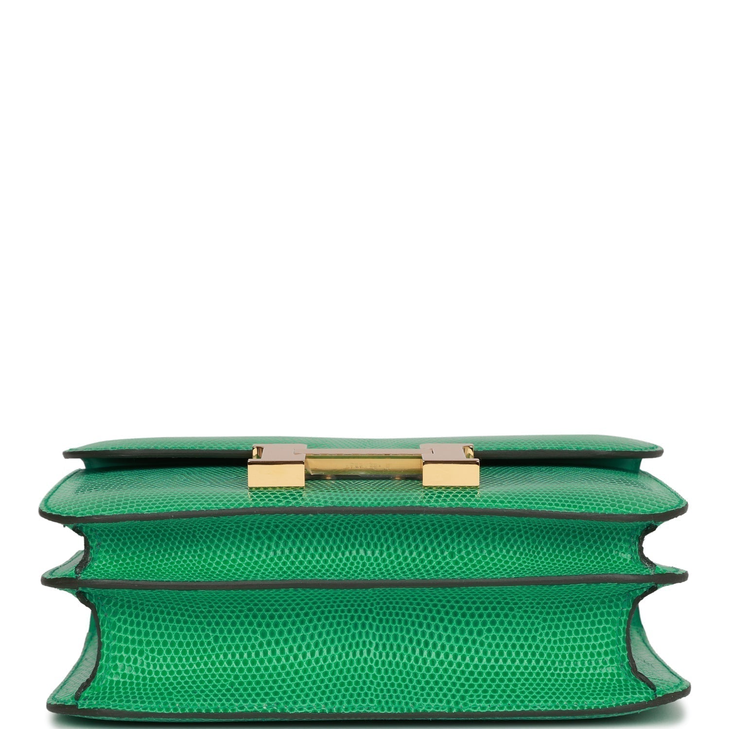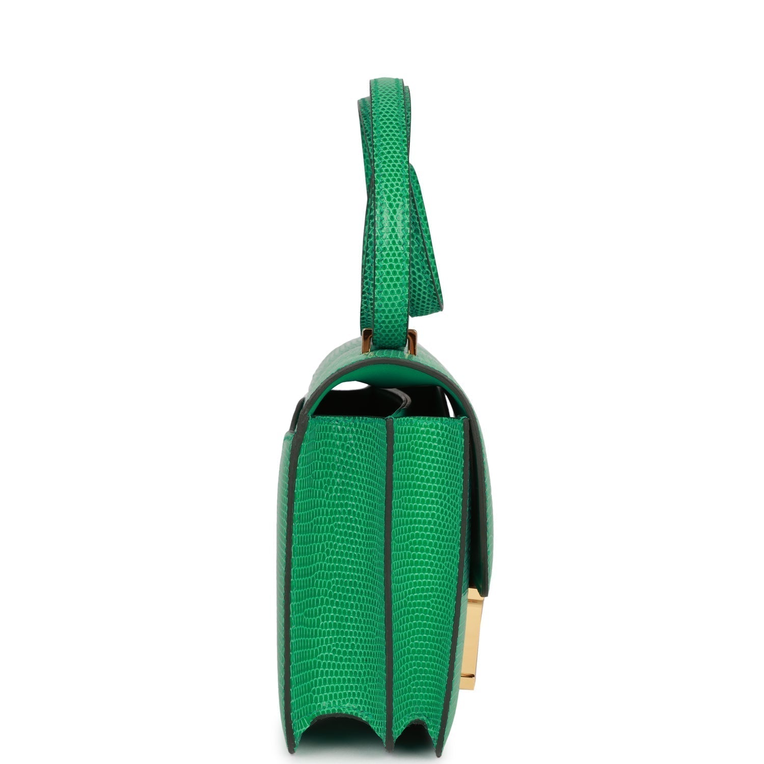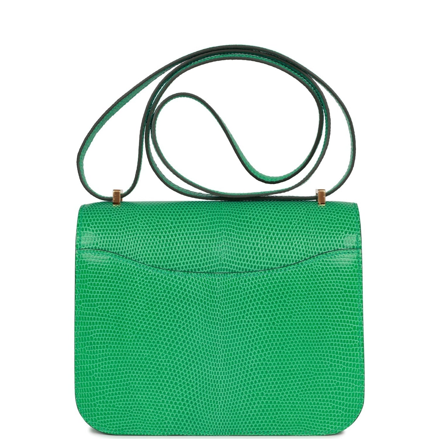 This Mini Constance is in Menthe salvator lizard with gold hardware and has tonal stitching, gold "H" snap lock closure and adjustable shoulder strap.