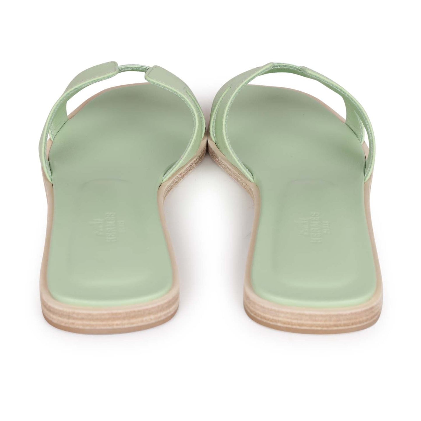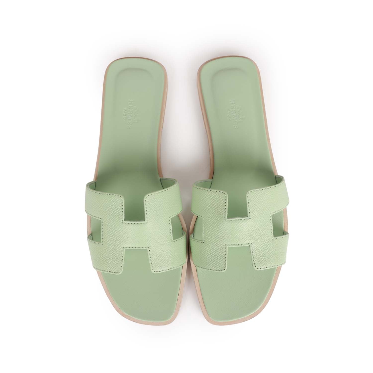 This pair of Oran Sandals are in Vert Jade epsom with the iconic H crossover strap and beige leather soles.