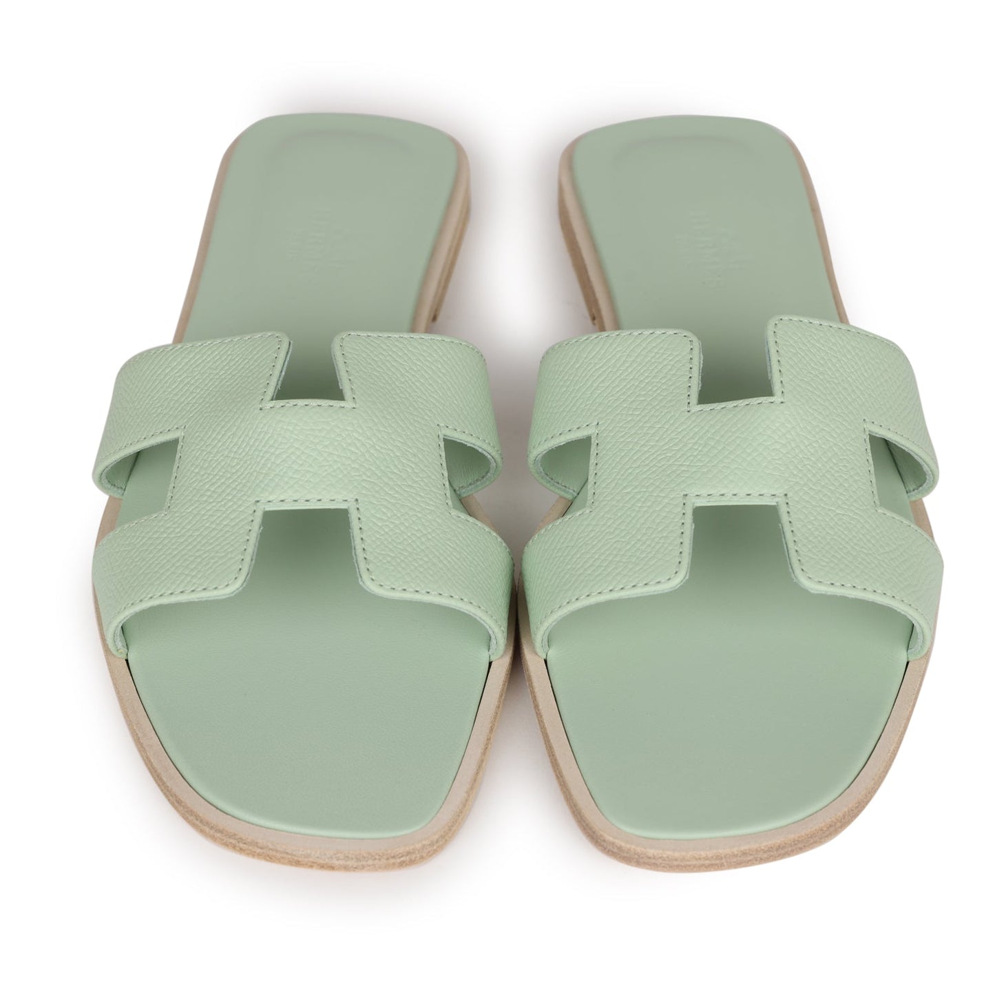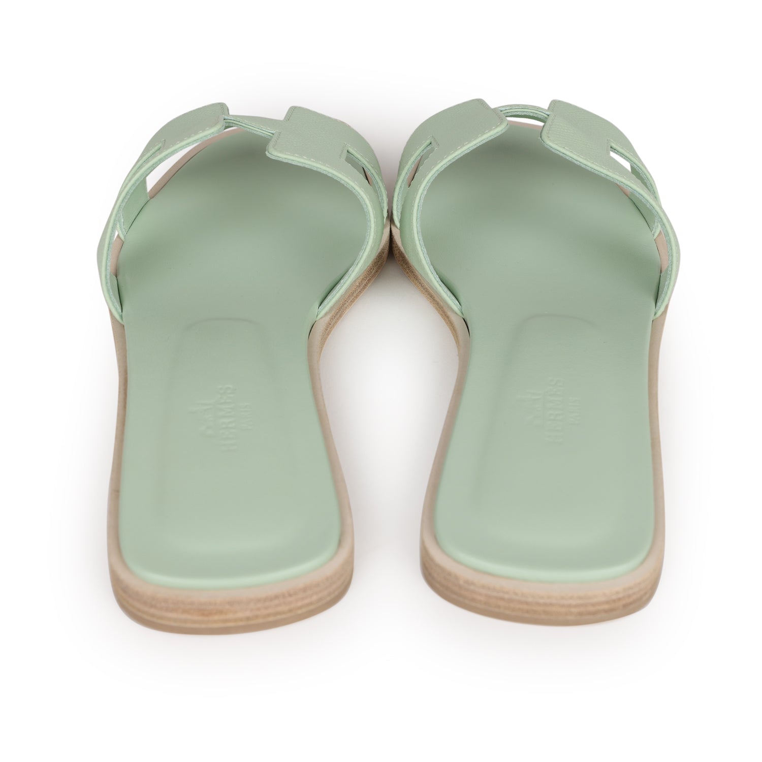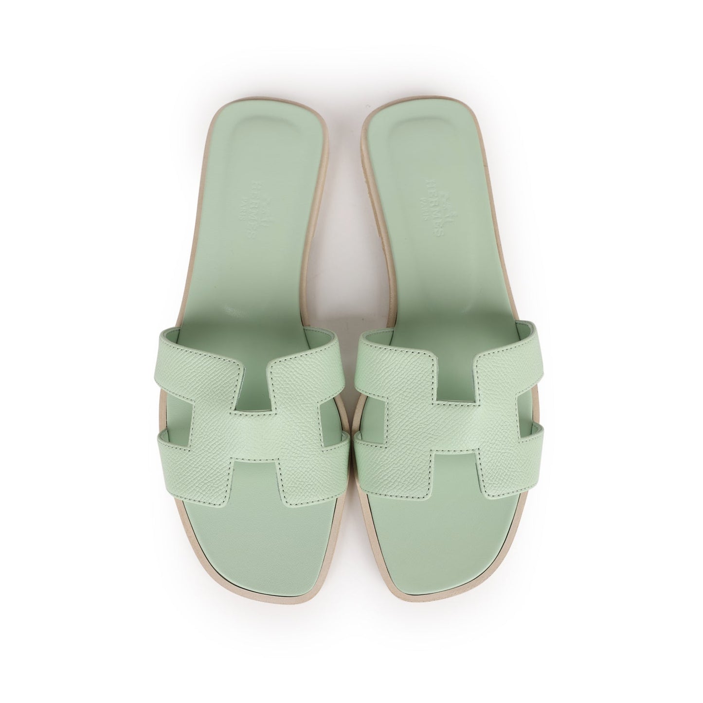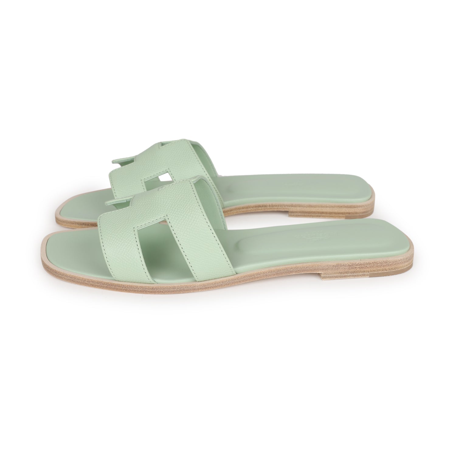 This pair of Oran Sandals are in Vert Jade epsom with the iconic H crossover strap, Vert Jade Goatskin insole, Grezzo leather heel, and natural leather soles.